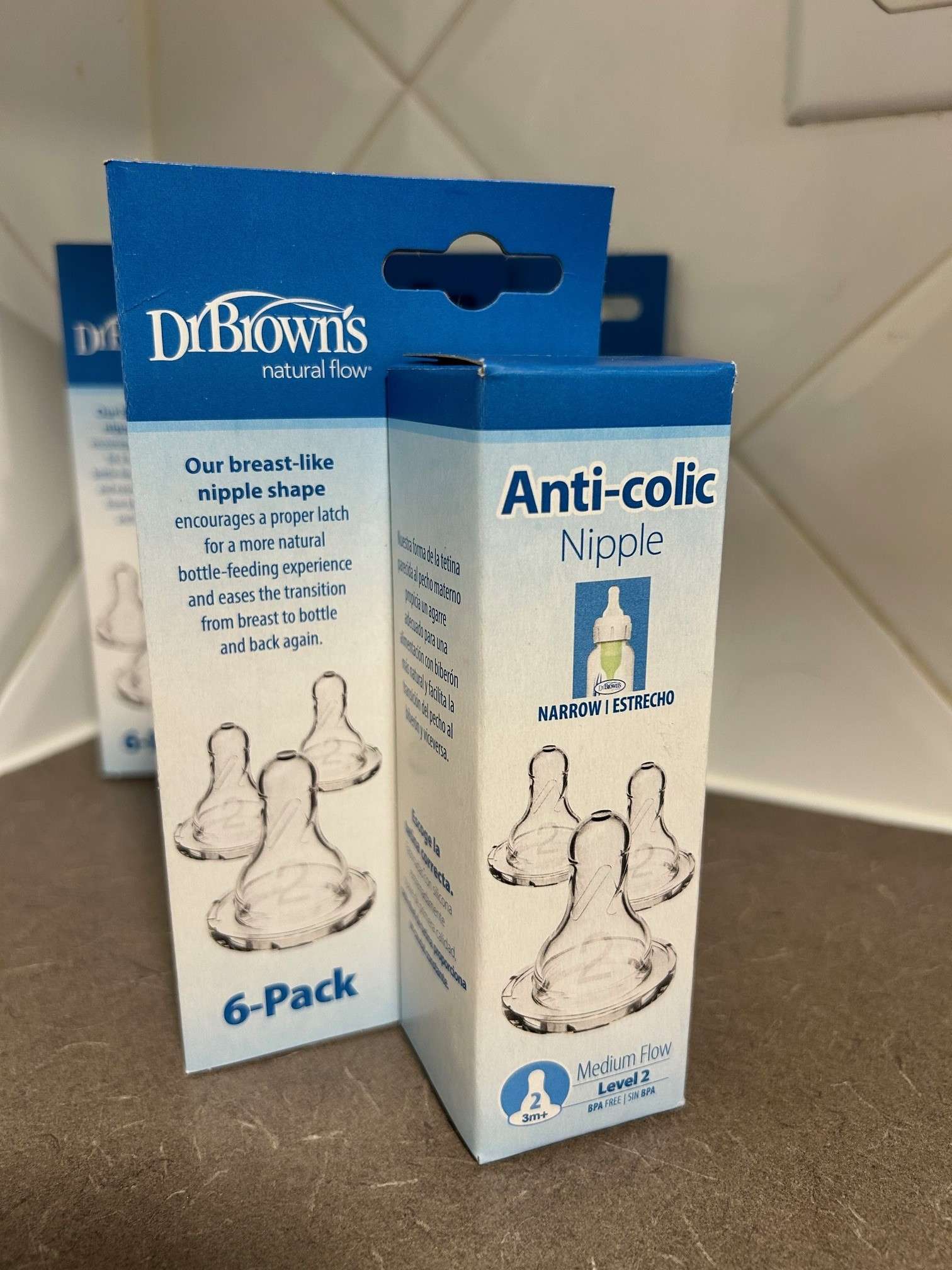 Description : BNWT Dr. Brown's Anti-Colic (Narrow) Nipples - Level 2 (3+ Months) . Two boxes with 6-nipples per box for a total of 12.