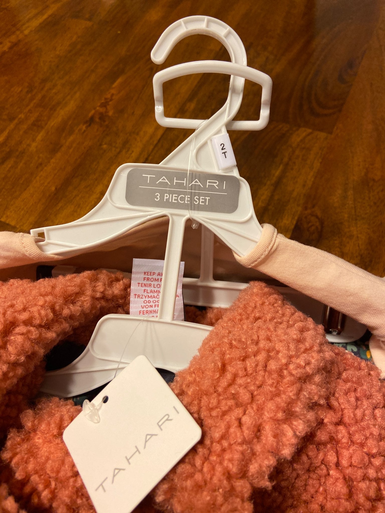 Description : Brand new outfit with navy floral pants, light pink shirt and fluffy dark pink coat. Size 2T