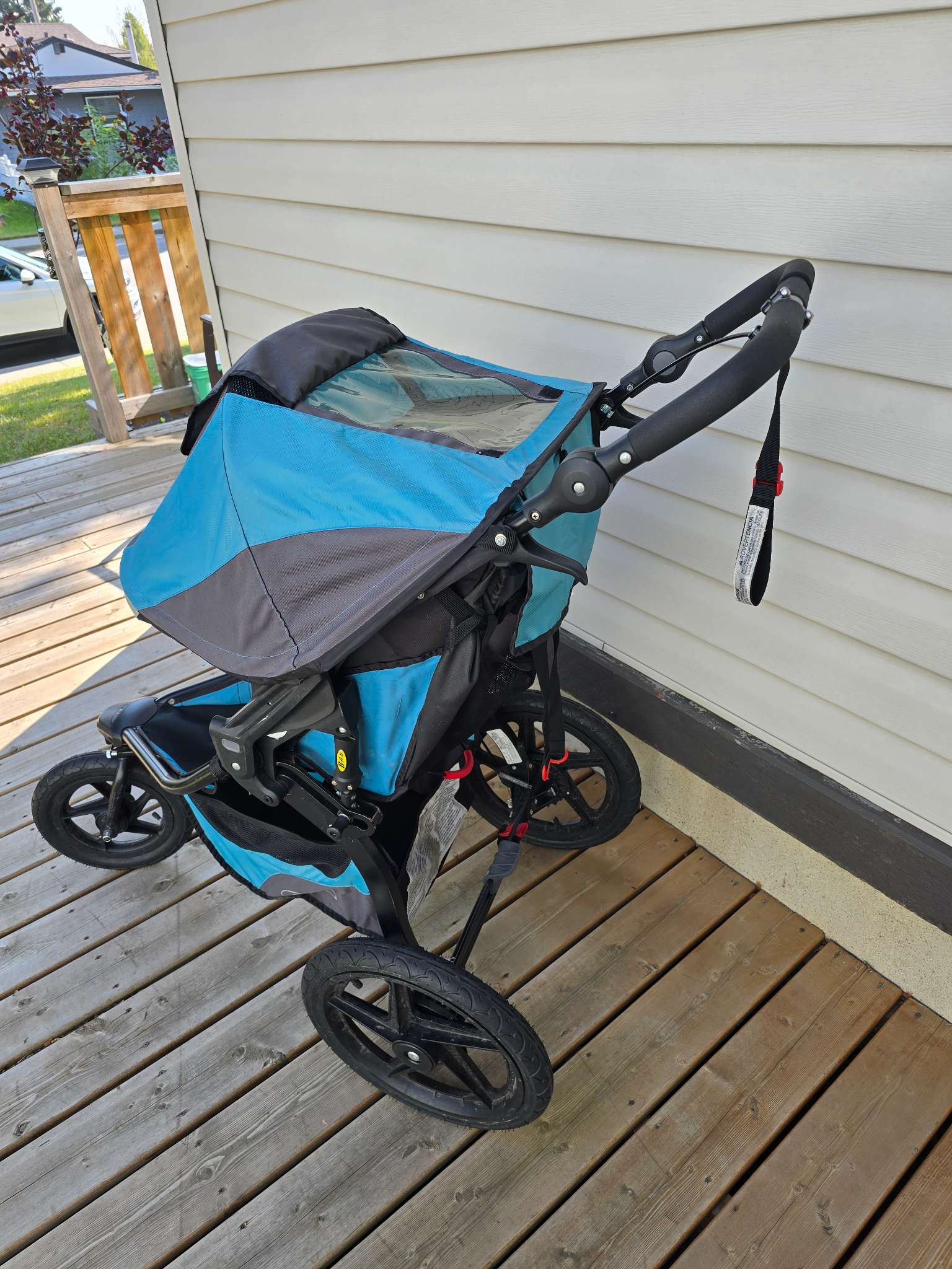 Description : The ultimate all-terrain jogging stroller, with mountain bike style suspension. The rubber, air filled tires create a smooth ride on any terrain and the adjustable multi-position handlebar gives parents of all heights the perfect fit with an easy to use hand and foot brake. The front wheel swivels for easy maneuverability and locks for greater stability when jogging. An easy two-step fold allows for convenient storing and transportations options. Excellent, Used Condition.