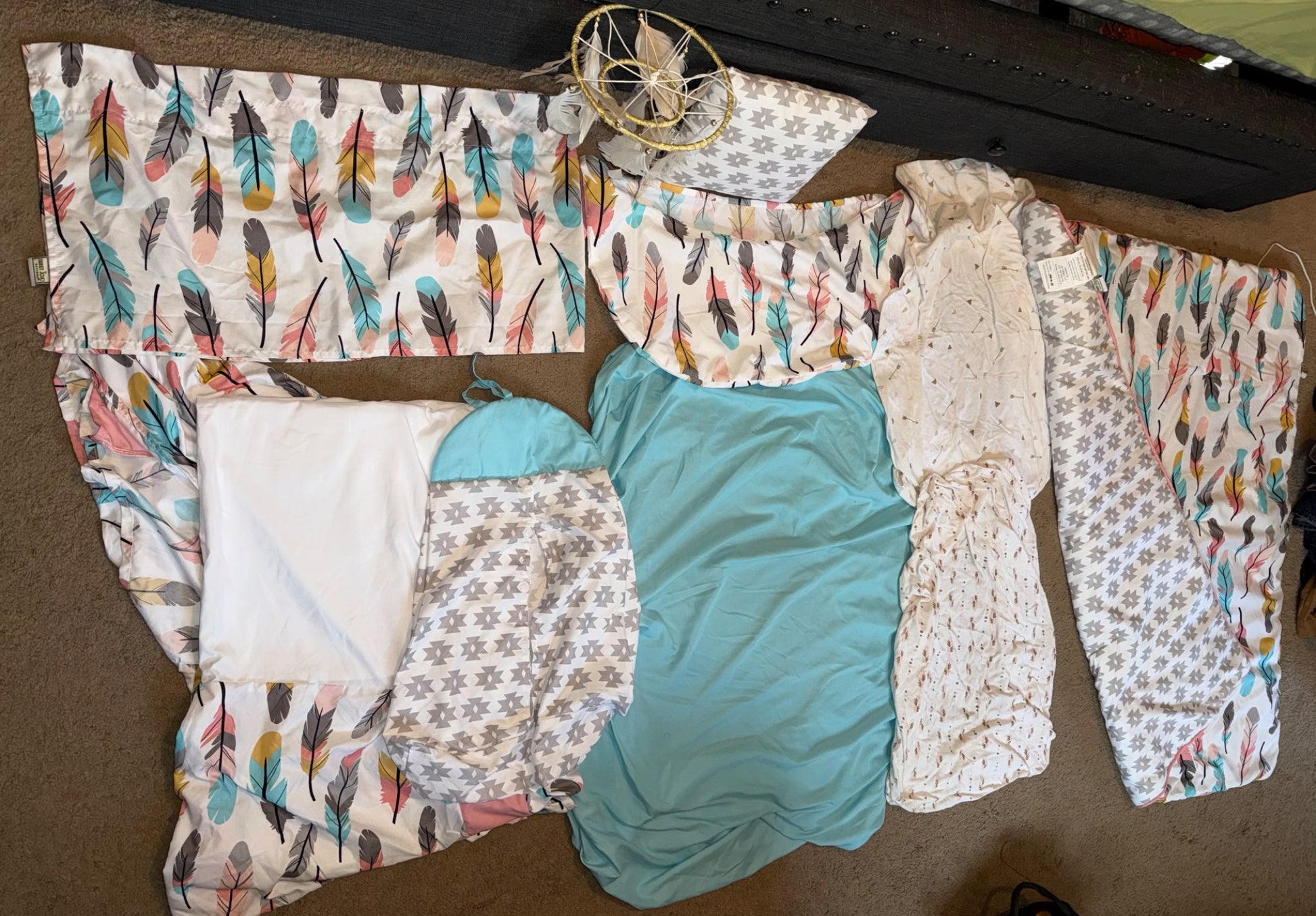 Description : I originally purchased the nursery set from Bed Bath & Beyond when they were still open. The nursery set is Sweet Jojo Designs & came with comforter, crib skirt, blue fitter sheet, window sham, accent pillow, diaper holder & toy holder that retailed for $130. I added into the set with a 2-pack change pad covers & feather mobile that were purchased off Amazon for $50 for both things. EUC, comforter was never used only ever displayed on the crib.