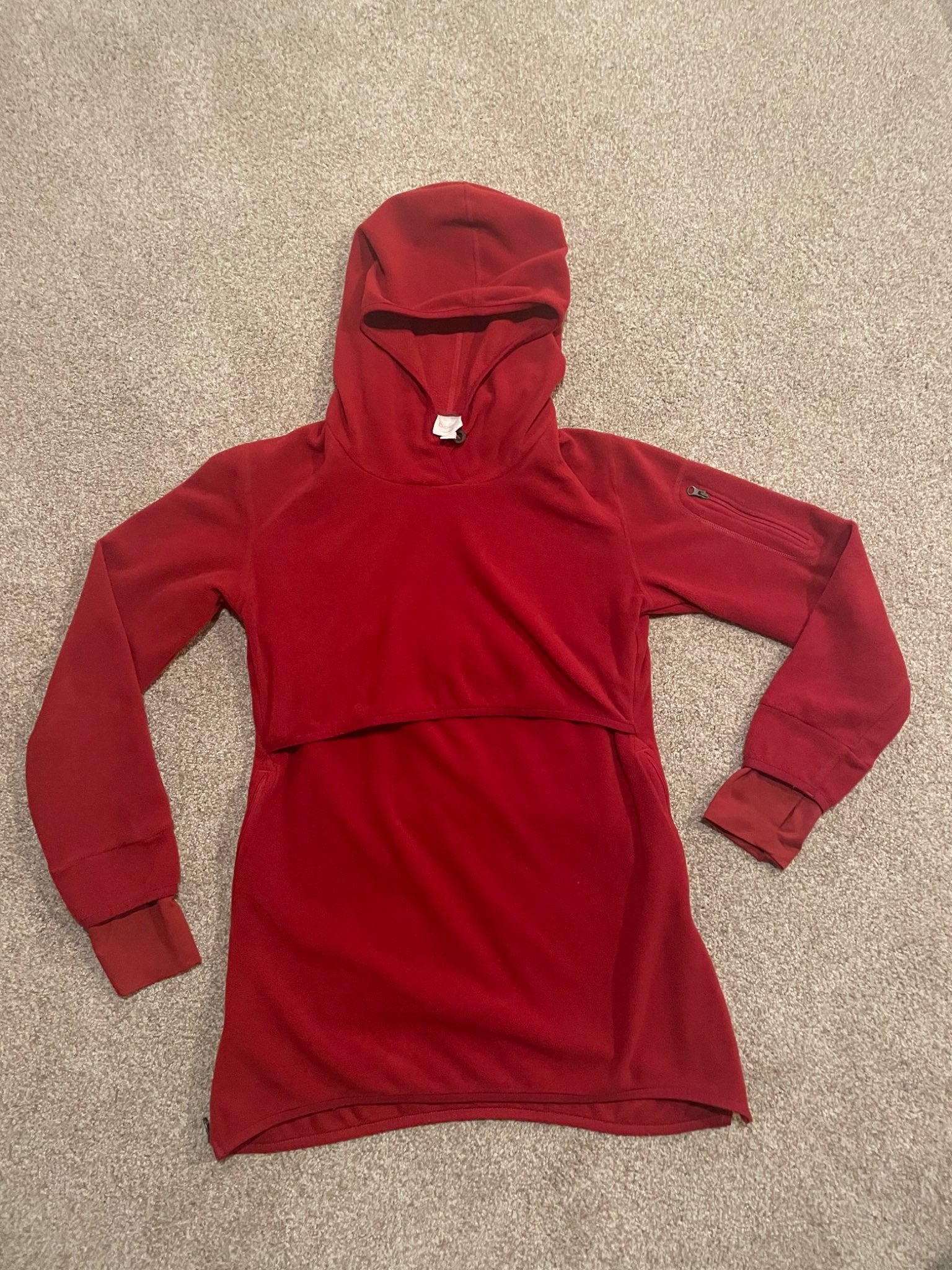 Features: Easy nursing access, both sides open for looser fit, warm fleece hood, thumbholes on the sleeve cuffs, zippered pocket on upper arm and two pockets on lower back.
