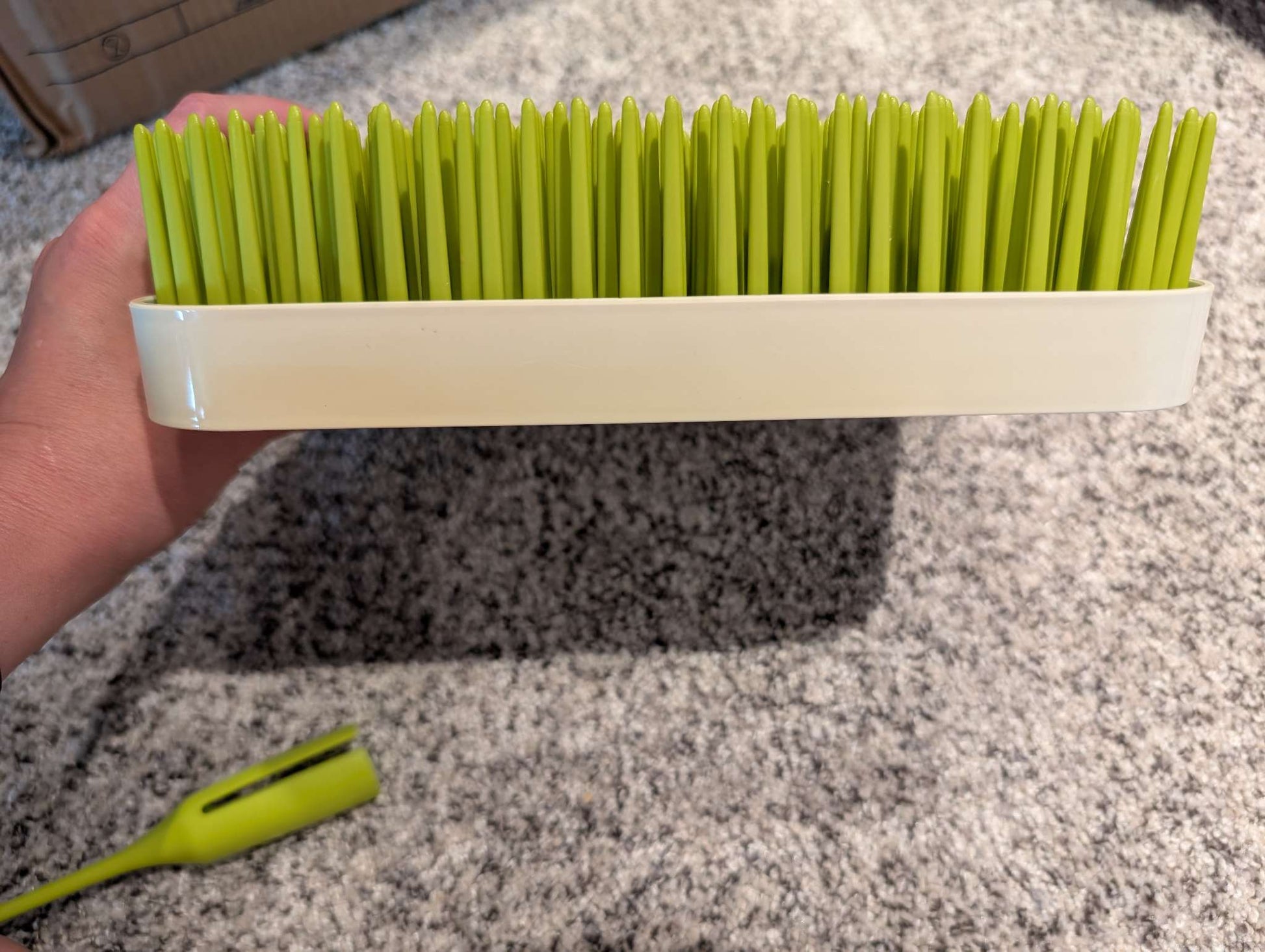 Description : GRASS: https://www.westcoastkids.ca/grass-1 $26.99 - Low-profile drying rack looks great in any kitchen - Perfect for drying items of all shapes and sizes - Easily holds items upright for drying while excess water collects in bottom tray - Two-piece, easy-to-clean design - Made without BPA or PVC - Dimensions: 9.5" x 9.5" x 2.5" Some sun discoloration on bottom tray. STEM: https://www.westcoastkids.ca/stem $8.99 - Holds bottle and small sippy cup parts - For use with Boon counter top drying racks - Provides more space for drying larger items