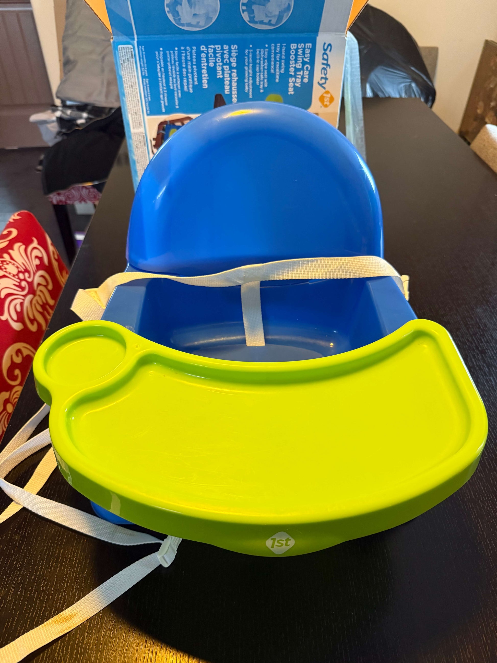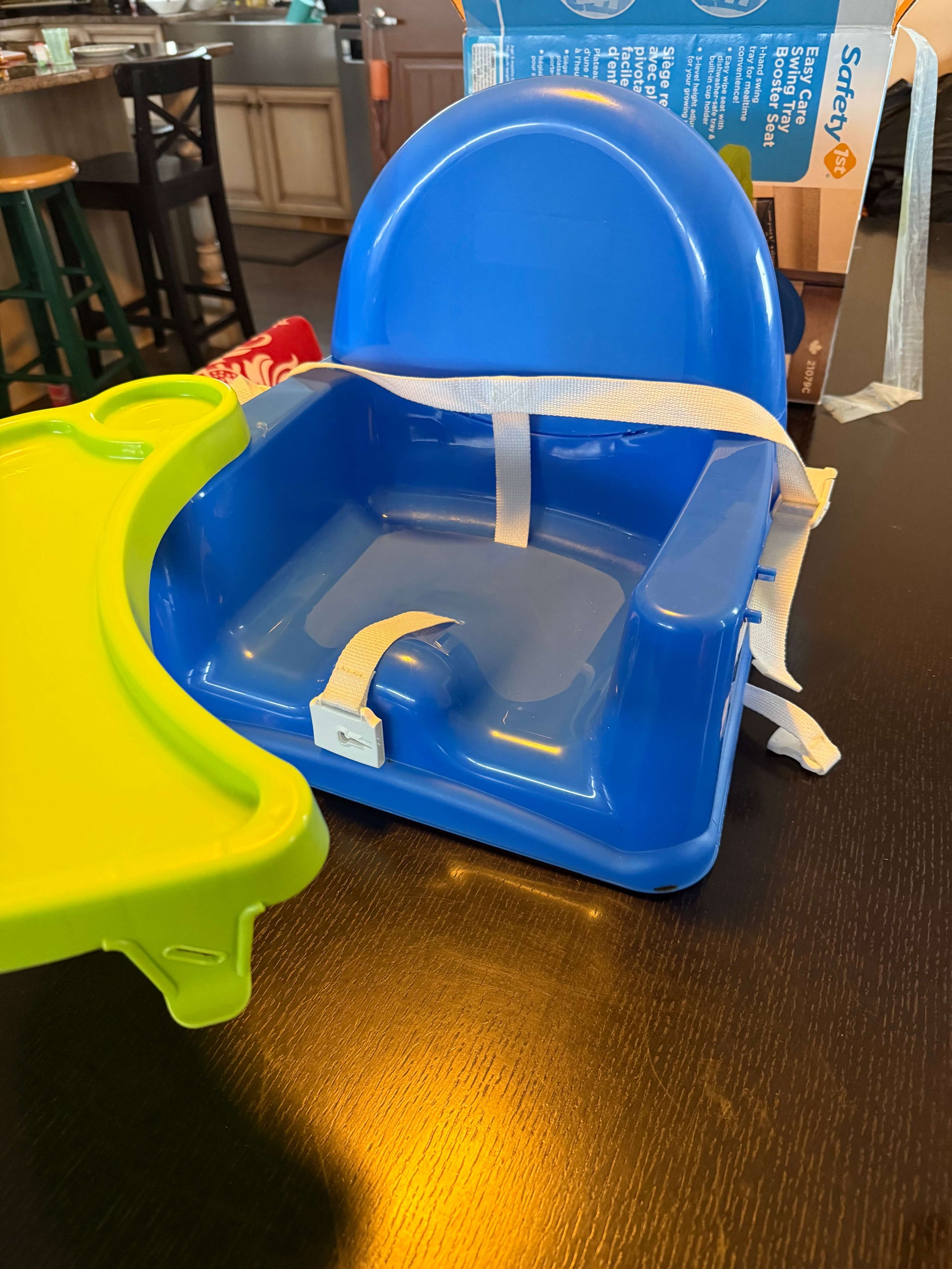 Description : The Easy Care Swing Tray Feeding Booster is simple to use and easy to clean. Its tray stays attached on one side and swings out of the way, making it easy to get your child seated securely for mealtimes. After one of those messy meals, the smooth seat design wipes down effortlessly, and the tray is dishwasher safe for quick and simple cleanup. Thanks to its lightweight design, this booster is easy to store at home or take with you on the go. Small amount of staining to one strap.