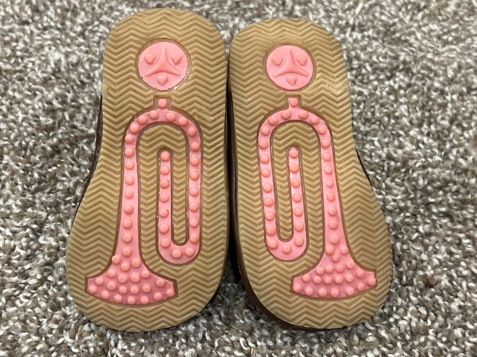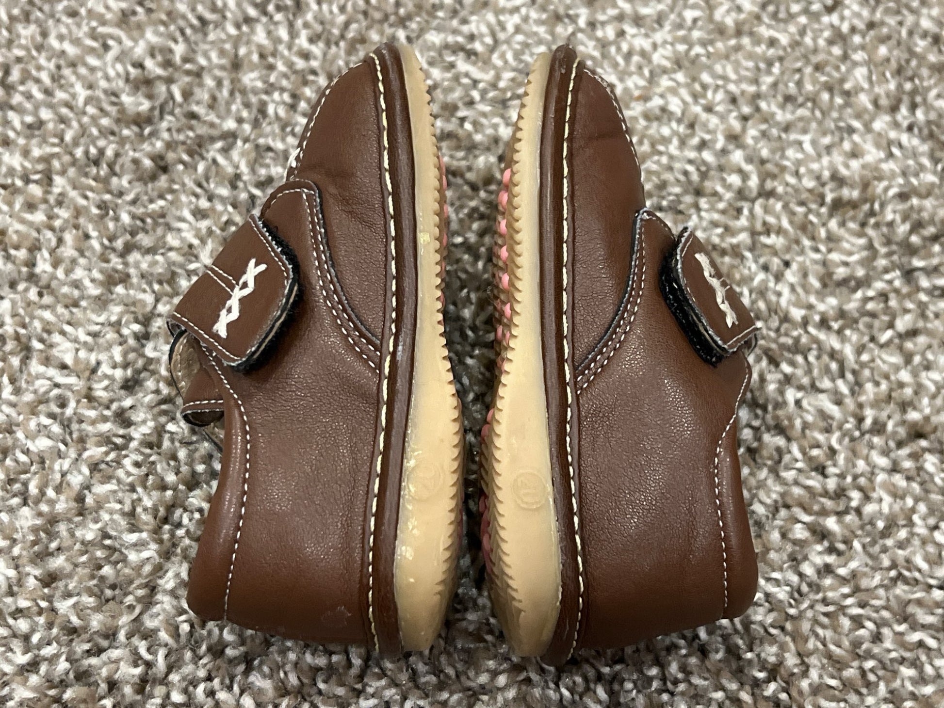 Description : Boys, Brown Toddler Squeak Shoes, Brown, Approx. Size 4, VGUC. Cute shoes that squeak when child walks. Some wear on the edge of the toes (see photos). Price reflects same.