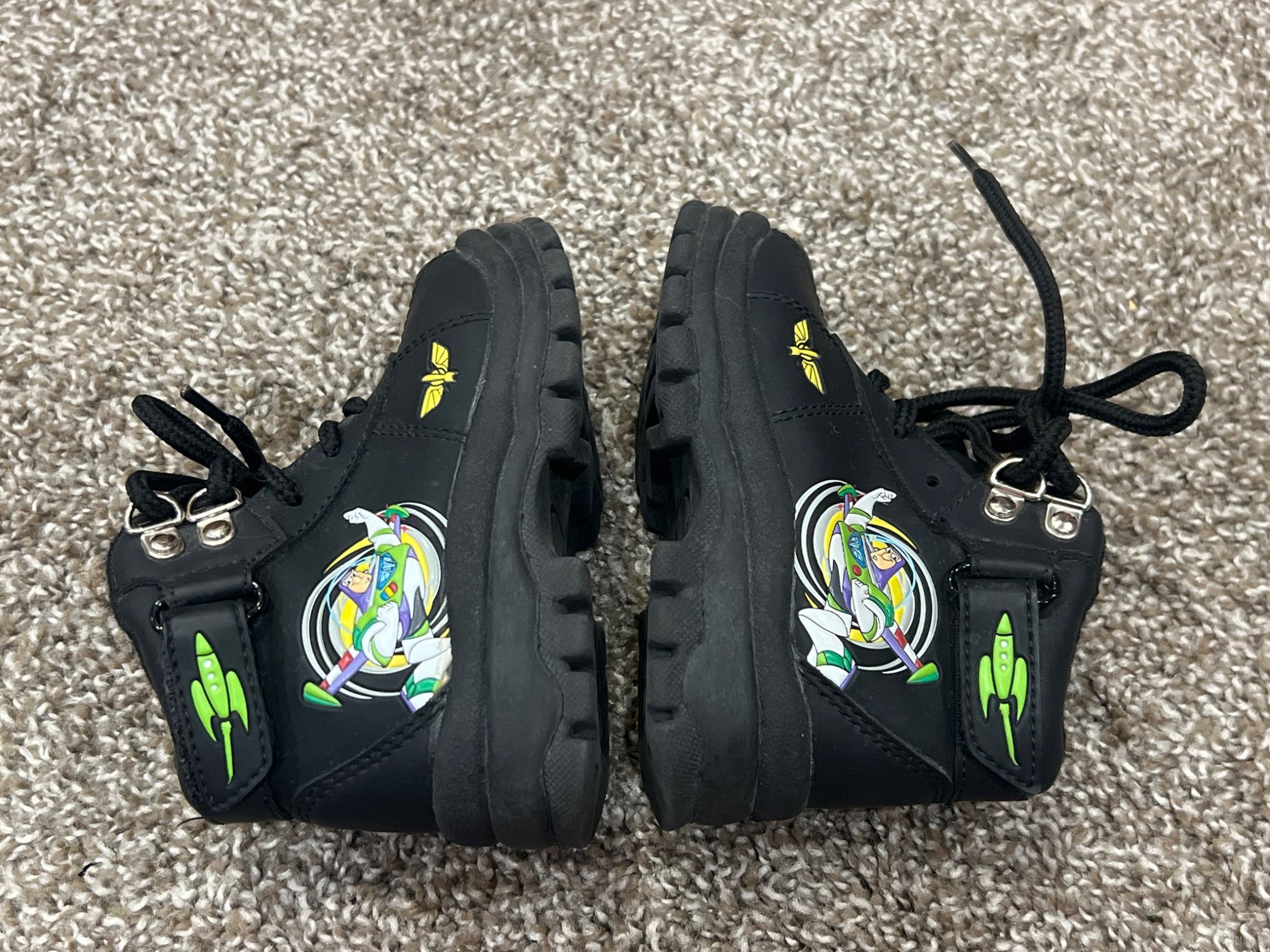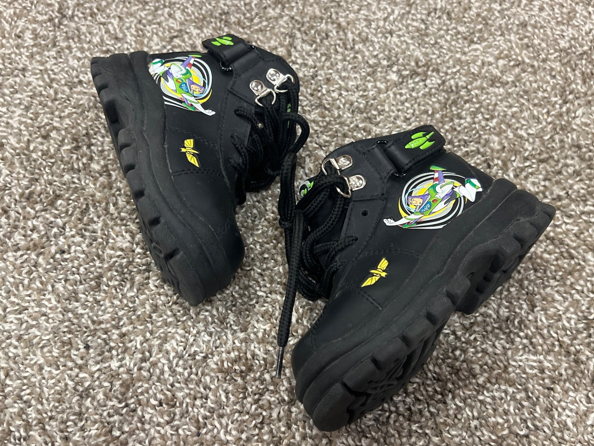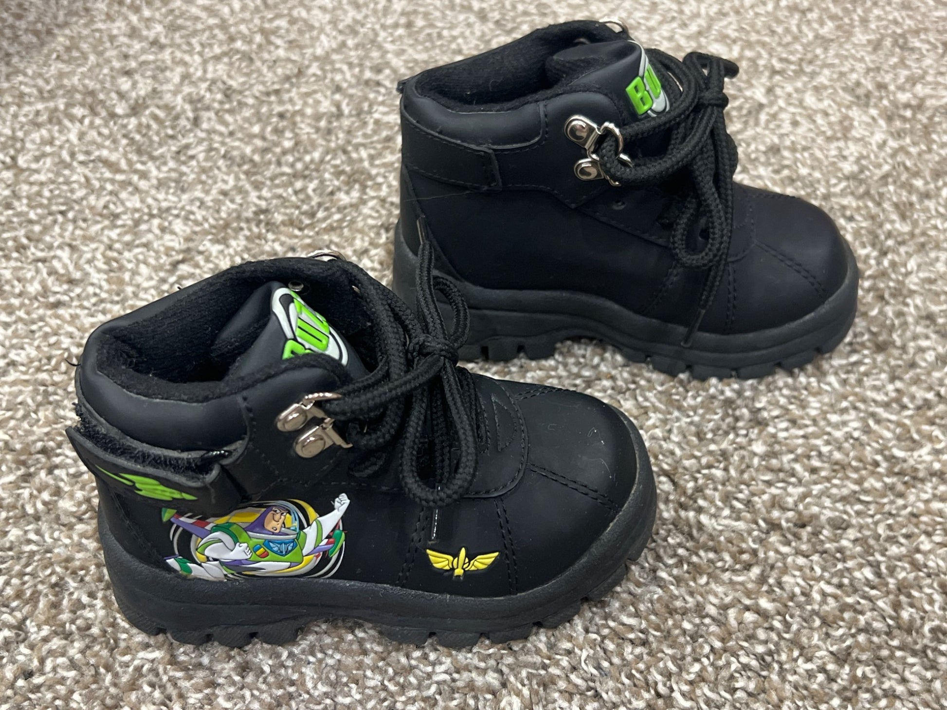 Description : Boys Buzz Lightyear Black Hiking Boots, size 6, VGUC. Super Cute little hiker style boots with Buzz Lightyear design.