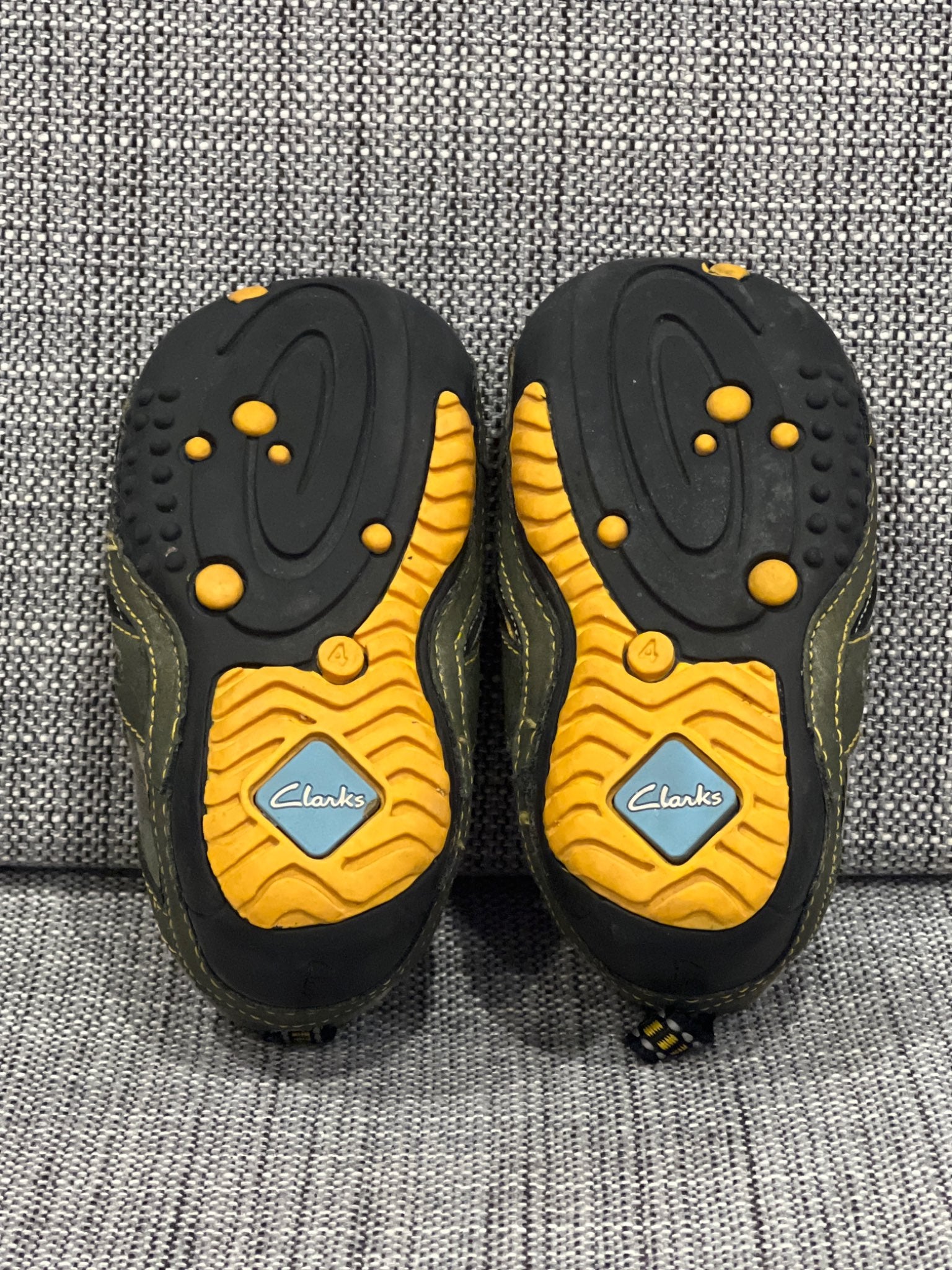 Description : Boys Clarks Camouflage Running Shoes Sneakers, size 4F UK (20 EU) = 4T-4.5T US, Very Good Used Condition (VGUC). These were purchased in the UK for £39 (~$90 Cdn). The shoes used to light up when walked on, however only one shoe now lights up, however still super cute and does not affect the quality of the shoes!