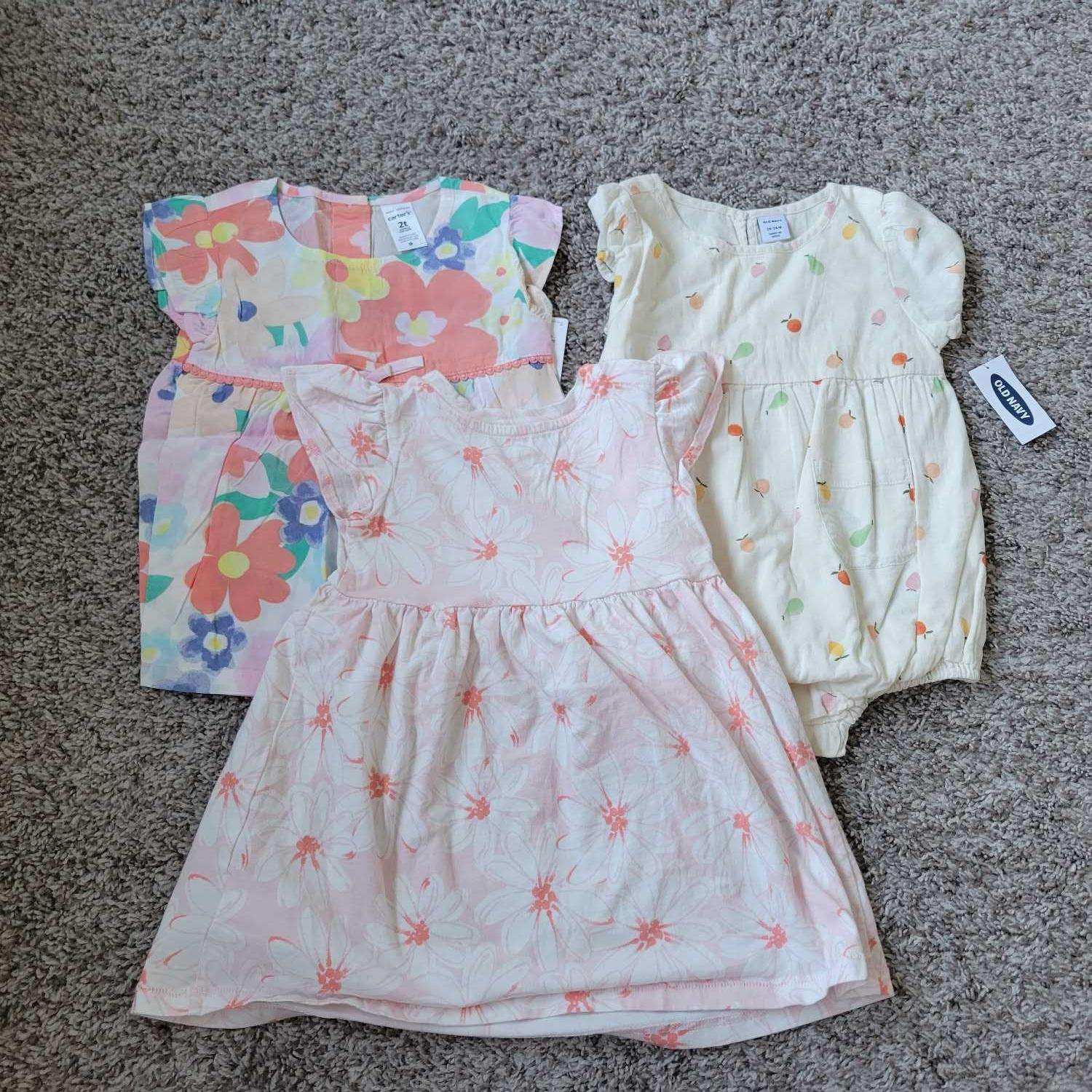 Description : Brand new- 3 Dresses 18-24 months/2T Bundle Carters- Floral Dress 2T with tags GAP- Pink Floral Dress 2T brand new without tag Old Navy- Fruity Onsie 18-24 months with tags