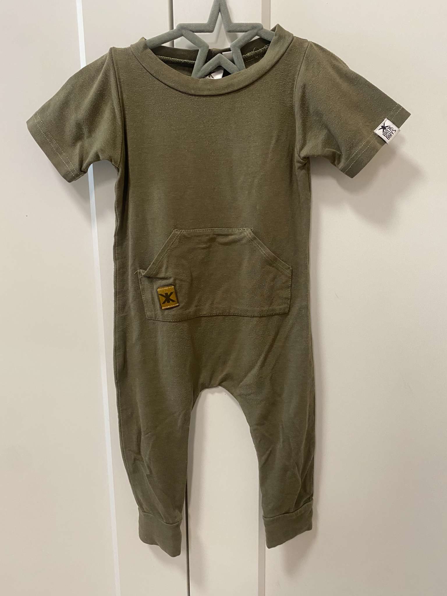 Description : Olive green cotton jersey romper from Brok Boys. Sized 6/12 month but very stretchy and may likely fit a little older.