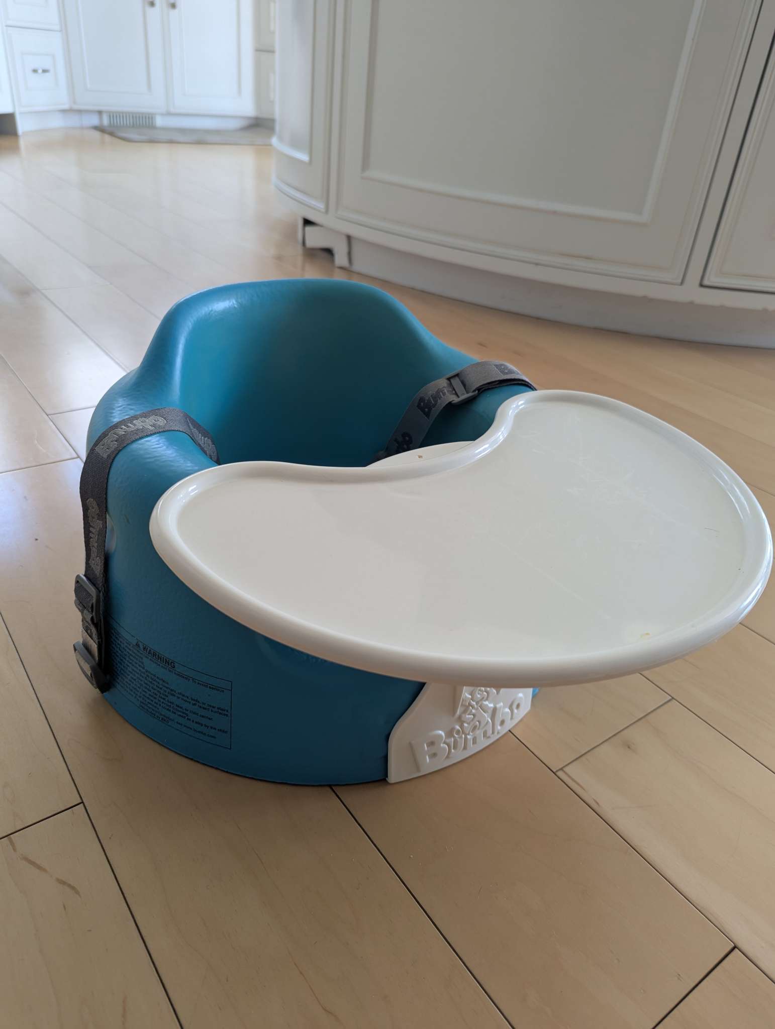 Description : Bumbo turquoise blue seat with safety belt and table, new set up is $130+tax