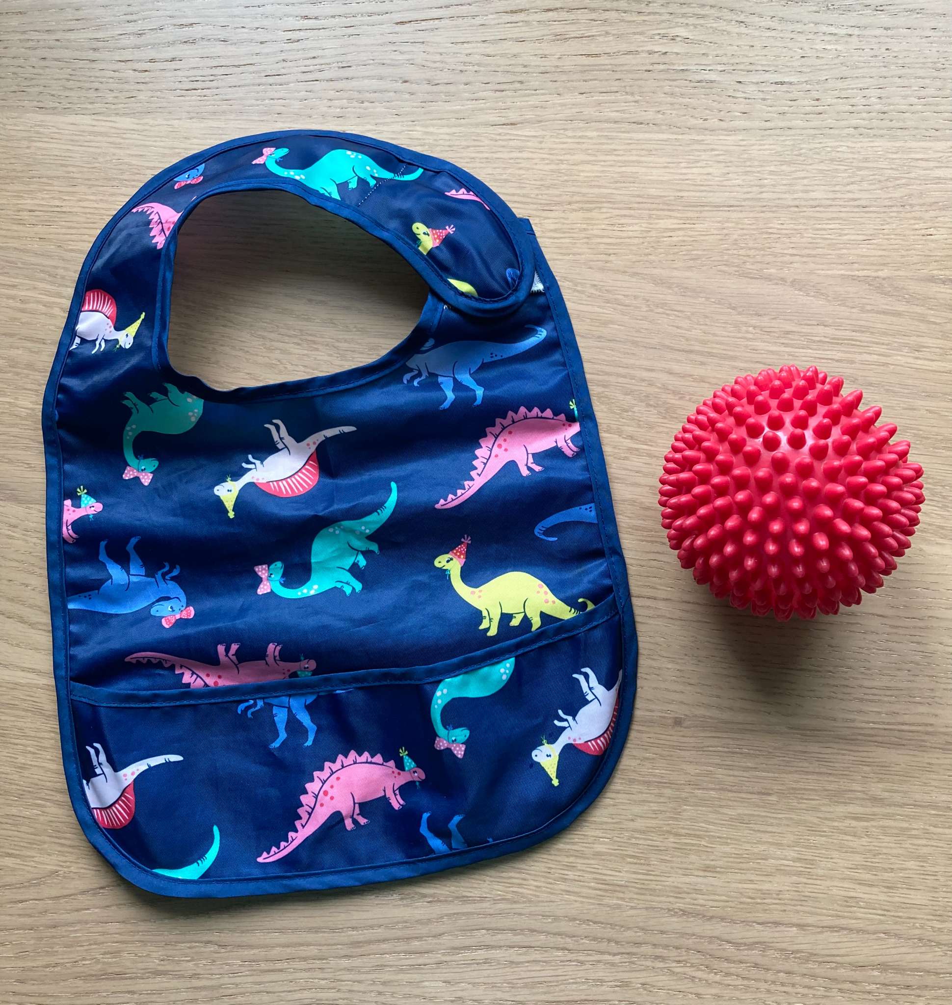 Description : A nice combo of useful items - a bib and a soft rubber sensory ball (great for teaching your child to roll the ball, play with it, and is also wonderful for gentle massage)