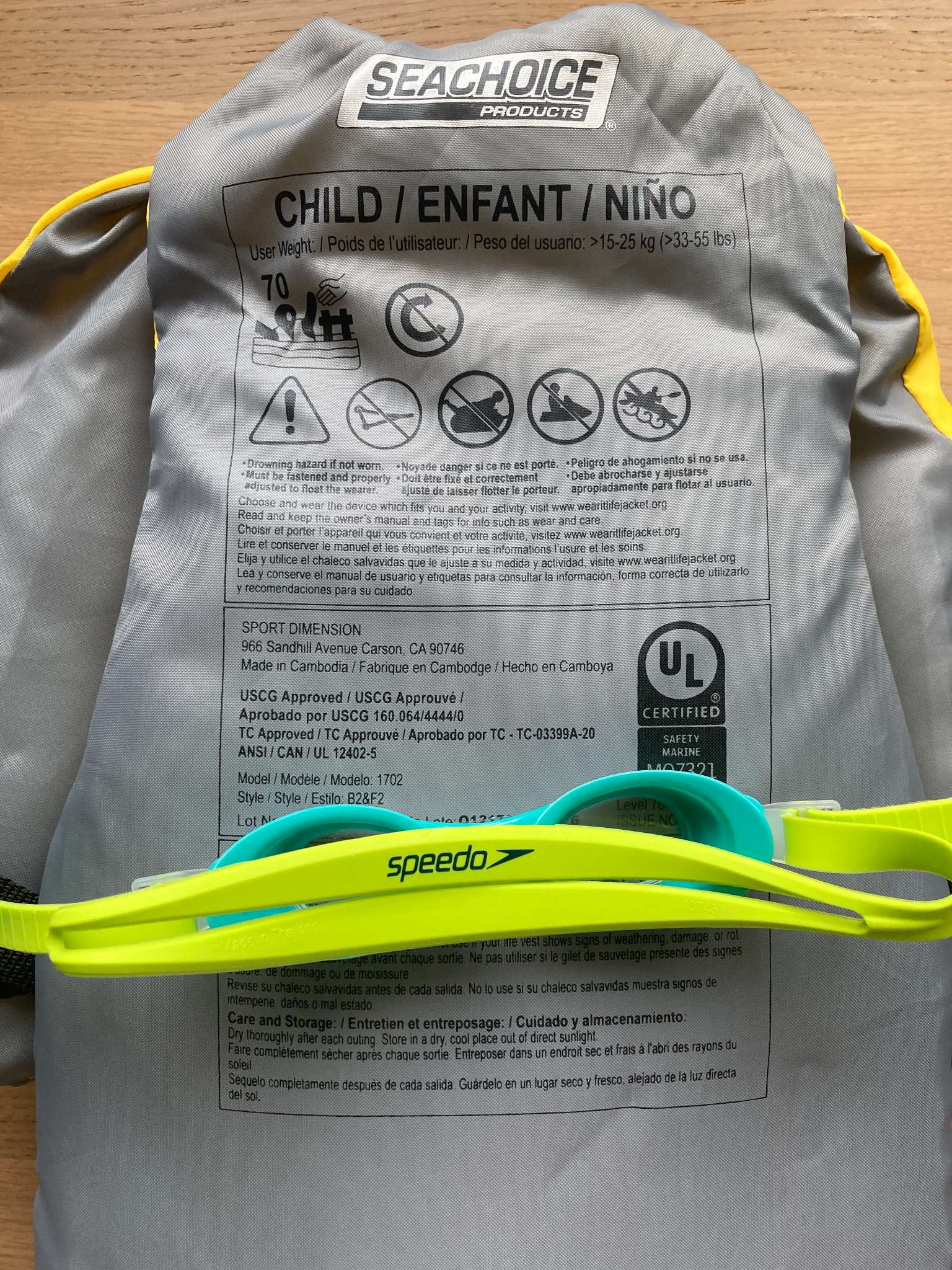 Description : A great combo of a bright yellow life vest and goggles. Fit 3-6 yo children.