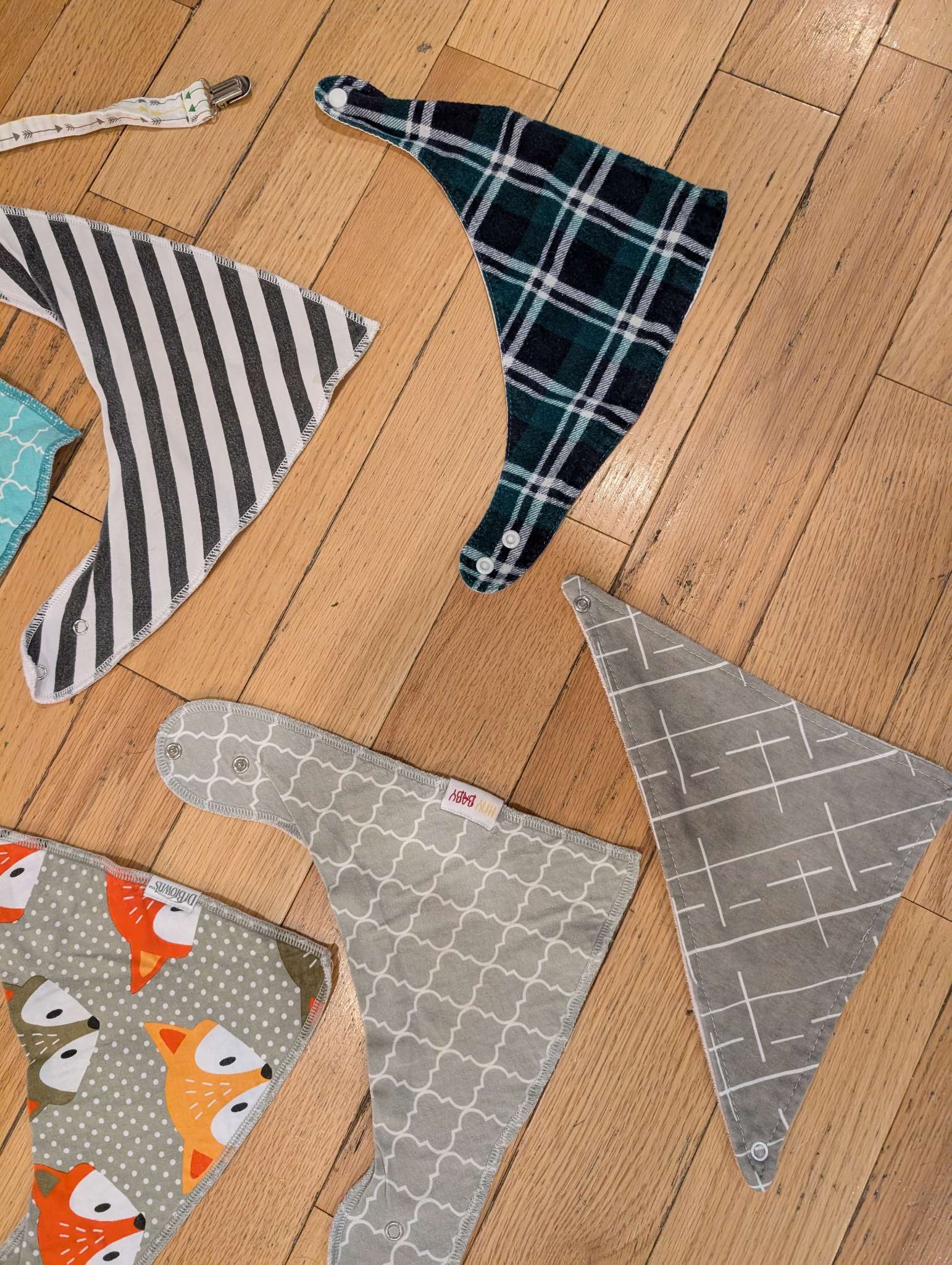 Description : Bundle of 8 bibs as shown in photos. No stains but some have some washwear. Brands include: Copper Pearl, Alva Baby, HNY Baby and Dr. browns + other. 2 Soother Clips from Amazon.