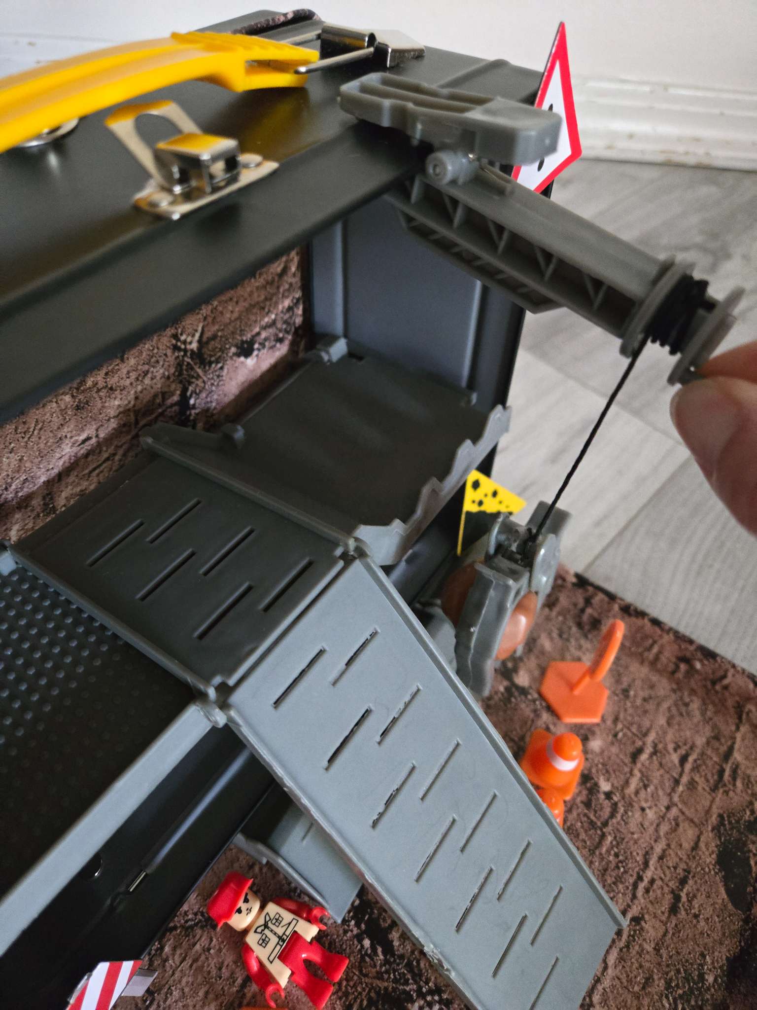 Description : CATConstruction Site Playsets including a rotating crane, rocks, figure, magnetic signs, 2 contruction vechiles<br> Everything can fit in the tin case for easy storage<br> Handle on tin case for easy on the go play