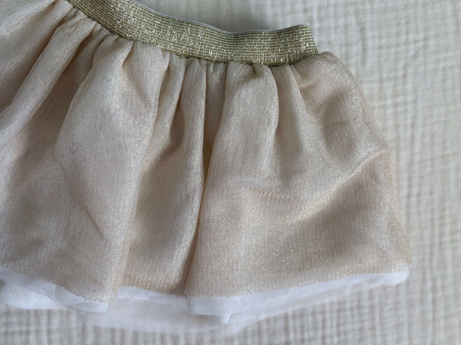 Description: Multi-layer skirt with gold glitter threading and attached cotton diaper cover