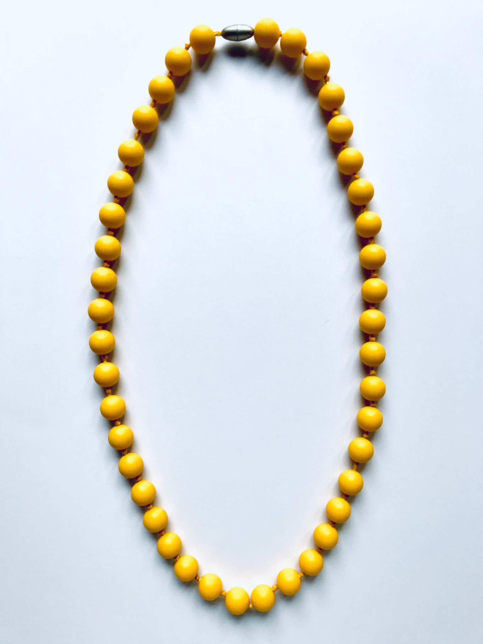 Description : Chewbeads silicone teething necklace in yellow. In very good used condition other than some wear on the breakaway safety clasp, was mostly played with as my babies did not use it as a teether. Also helpful for babies to fiddle with while nursing. Has been washed and is ready for a new owner. Pet and smoke free home.