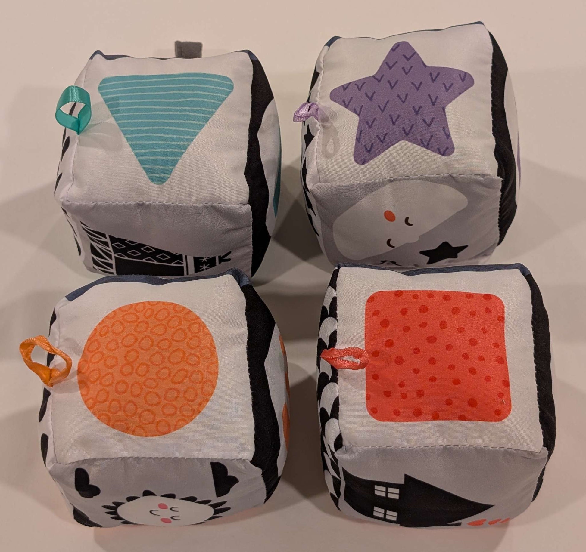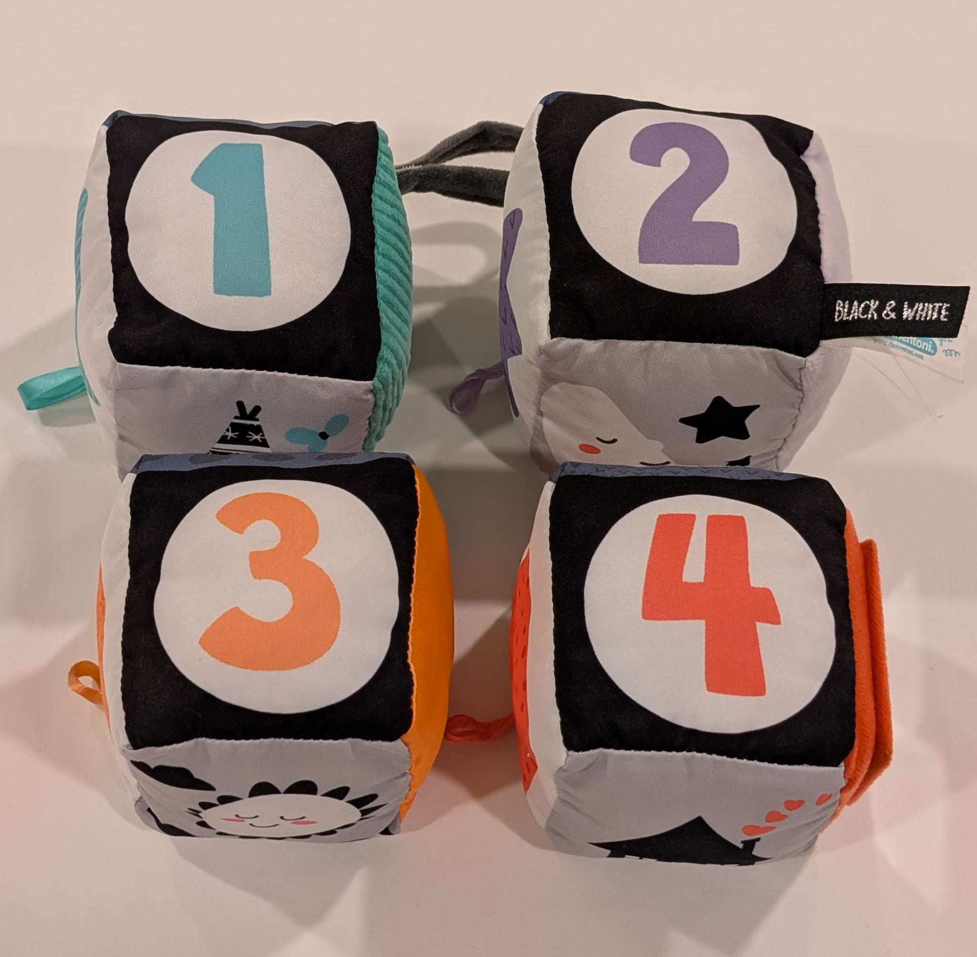 Description : Soft blocks, multiple textures,variety of pictures and patterns to engage with, block #1 has small Velcro ribbon that allows you to attach all blocks together Minor scratch on mirror as seen in picture