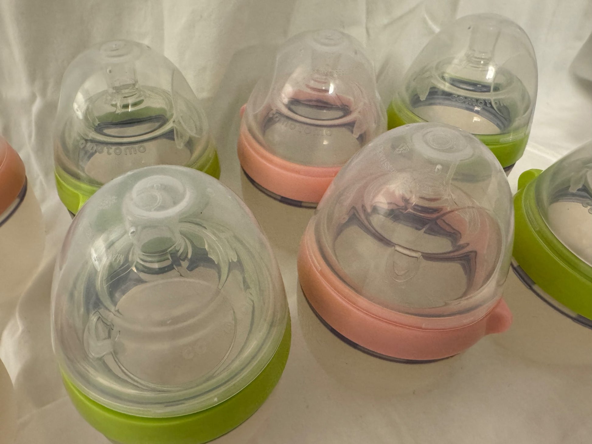 Description : Green and pink, never used (our baby preferred Avent). 8 bottles and two extra nipples.
