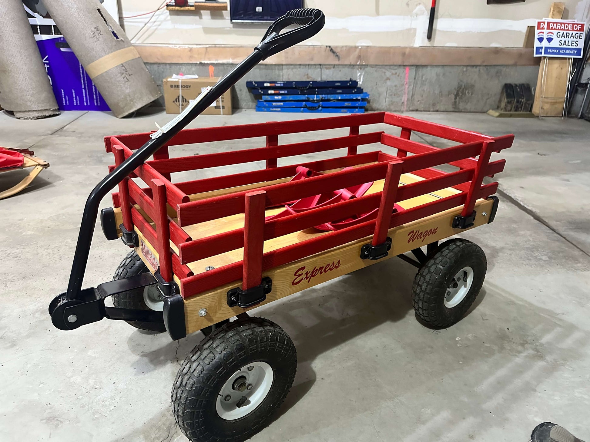 Description : This wagon can be used year round. This wagon comes with wheels for the summertime and sleigh runners for the winter time. 16“ x 34“ deck size. Most of these wagons come with plastic wheels, but this one has rubber wheels which adds to the comfort of the ride. Also comes with four sleigh runners for winter to use. Sleigh runners have ridge bottom for easy tracking in the snow. Handcrafted in Canada. Weight capacity up to 250 pounds. Anti-tip steering assembly keeps your valuable, cargo intact and balanced over the wheels when making tight turns.