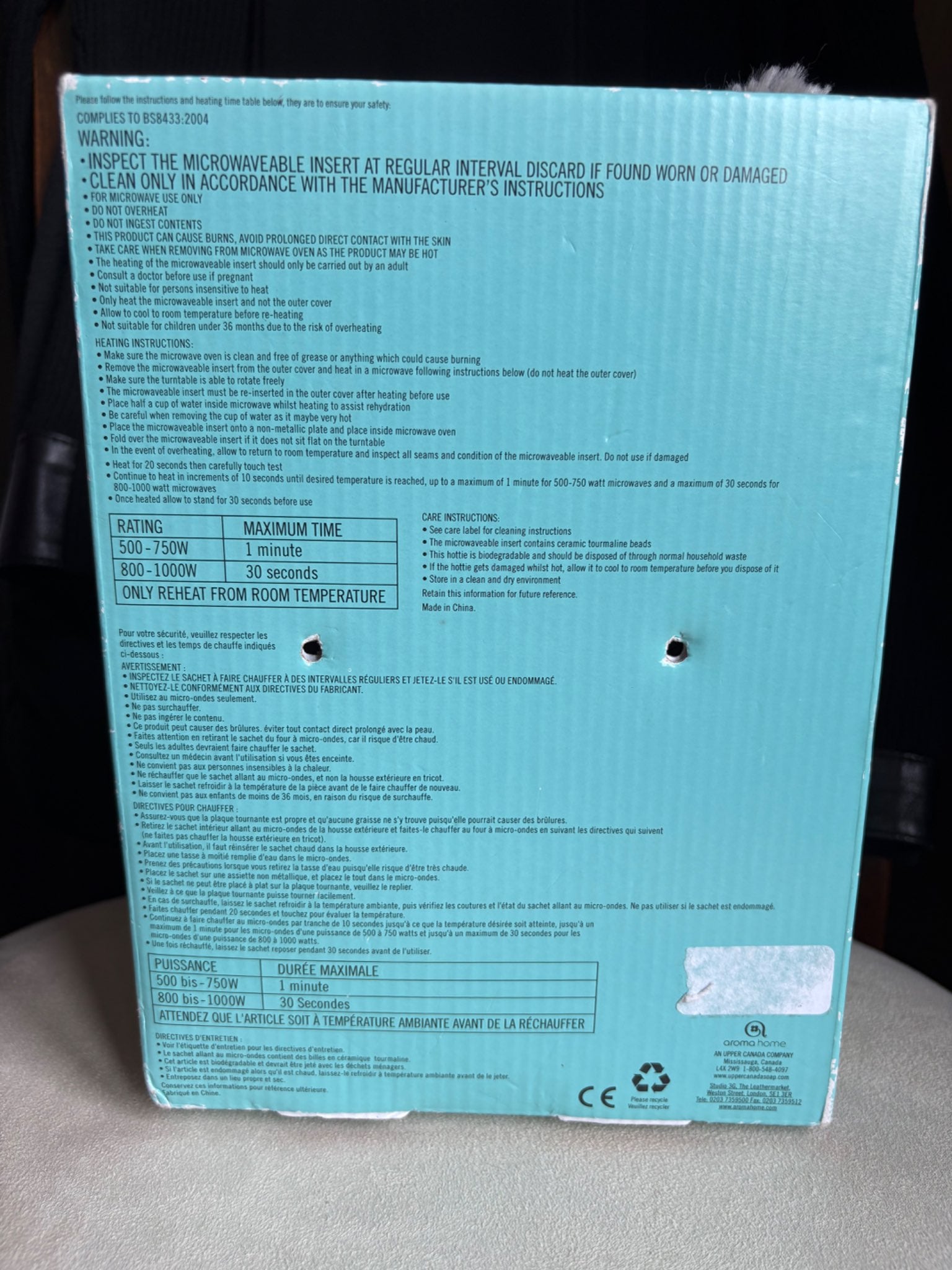 Description : Microwaveable plush for comfort and sleep aid. In excellent condition (box has damage from storage). Insert is removable for heating.