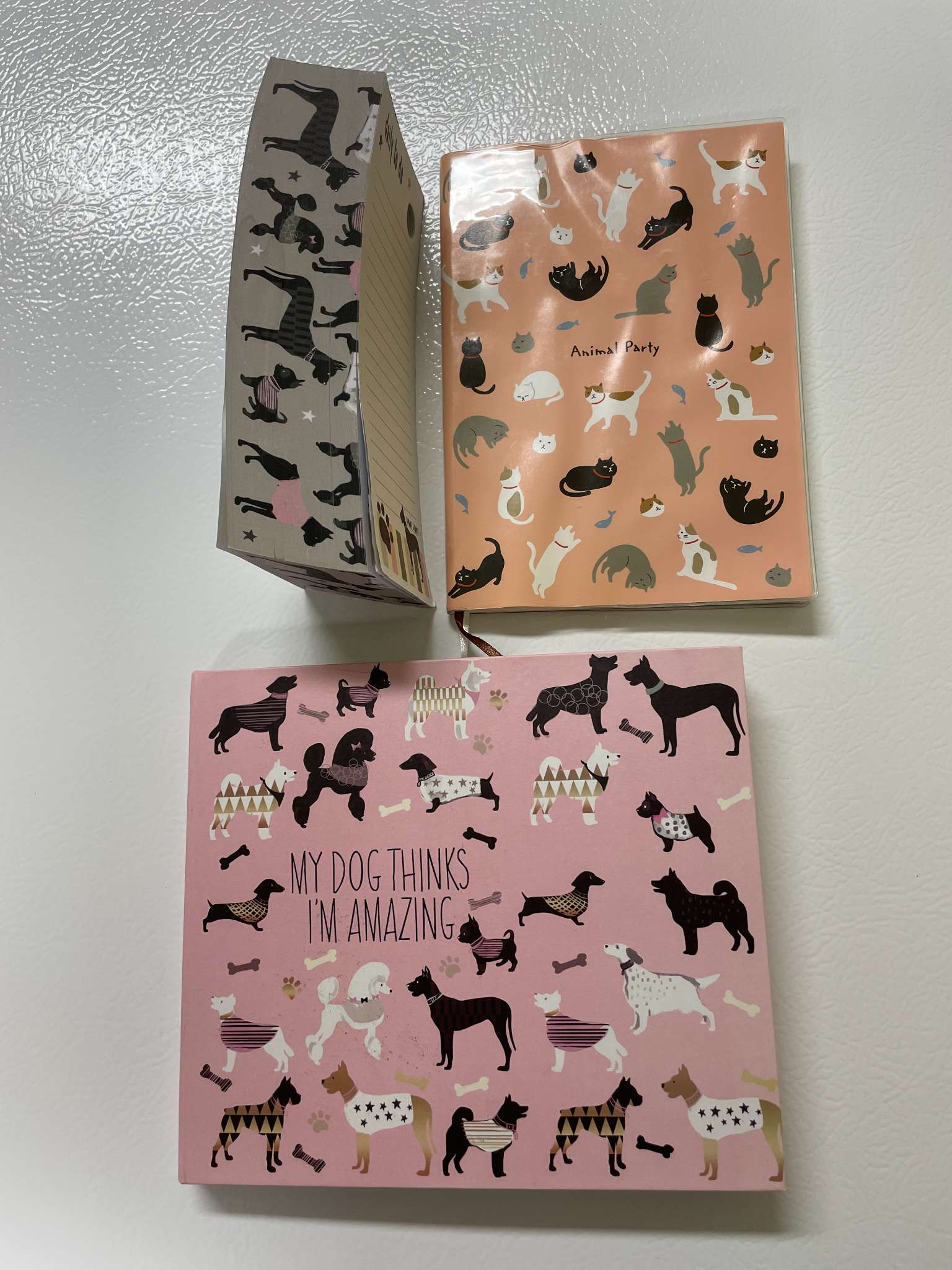 Description : Perfect for kids, students, or anyone who loves adorable stationery! This set includes: 📒 A dog-themed weekly planner pad with envelopes and sticky notes (“My Dog Thinks I’m Amazing” cover) 🐾 A “Daily To-Do” list pad with cute dog illustrations 🐱 A cat-themed notebook (“Animal Party” design) with lined pages ✨ Features: Fun, colorful designs with dogs and cats Great for organizing homework, chores, or creative writing Gently used, still in great condition