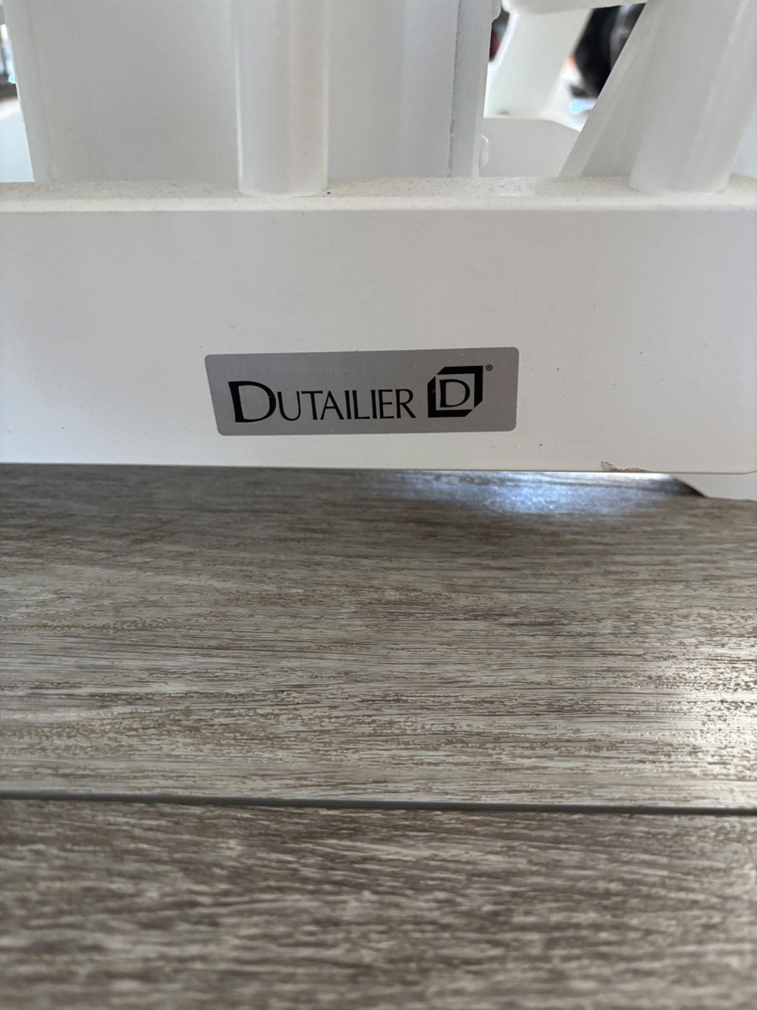 Description : Grey and white Dutailier Rocking chair with rocking stool.