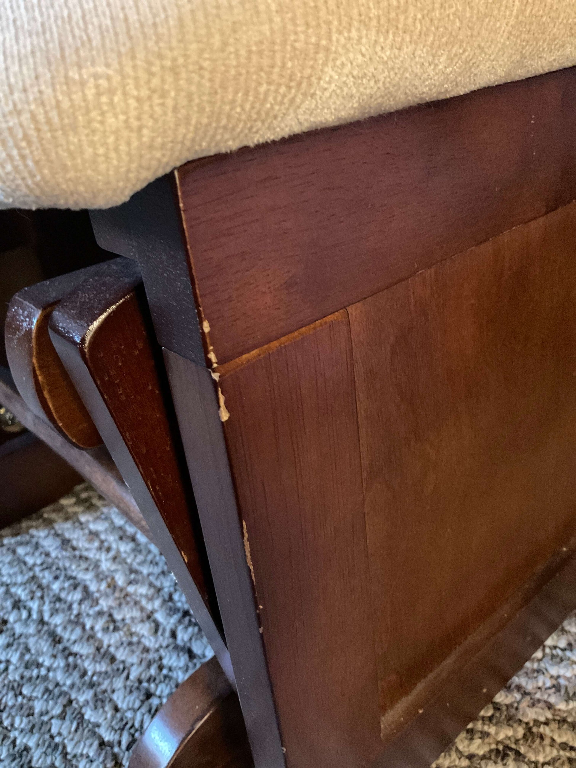 Description : Perfect for a nursery, gender neutral colouring usually retails for $490 Please note there is some slight discolouration and a few nicks in the wood, see photos for details The Eddie Bauer Langley Wood Glider and matching ottoman will provide you with the utmost comfort when bonding with your child during bedtime, or simply when taking a moment to relax before baby awakes. With thickly padded cushions, upholstered in soft, twill microfiber, generous seating, and high quality metal bearings for a smooth glide, the Langley Wood Glider will become a peaceful place to de-stress and cuddle with your baby. Thickly padded cushions, upholstered in soft, beige colored twill microfiber Generous seating High quality metal bearings for a smooth glide Available finishes: Walnut with Beige cushions Ottoman: 19-1/2in W X 15in D X 13.75in H