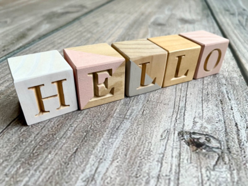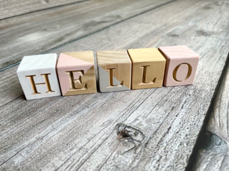 Description : Ellie & Rae (small US shop) handcrafted wooden decor blocks that spell “hello”, natural wood, white/blush pink, new condition, no tags. Only used as a product photo prop. Perfect for baby’s nursery, kids room. Measures 8 inches long, and the cubes are 1.5 inches width or length or height.