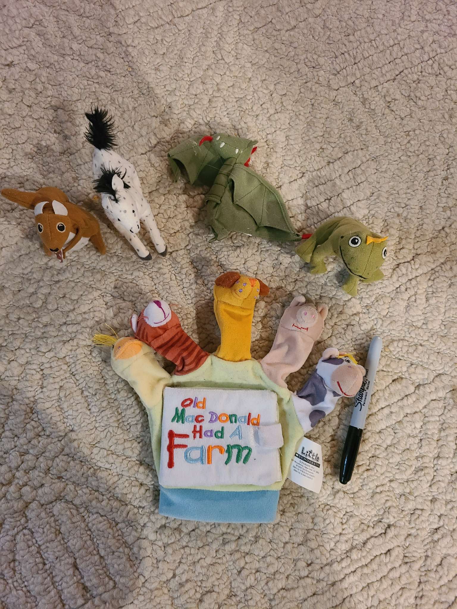 Description : Finger puppets and book.. 4 finger puppets ( squirrel, horse, dragon and feog) and a finger puppets book of old Mcdonald which has some farm animals