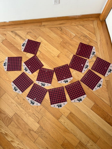 Description : Plaid bear birthday decorations. Bought all the digital files off of Etsy and then printed on cardstock paper, cut out and strung with brown rope. There is a “happy birthday”, “one” as well as “newborn-one year” photo banner. The photo banner has some white marks on it from where the photos were removed but can be easily covered with your own photos. Also has a black bear “one” cake topper and a gold number 1 candle (only lit once). There is also one red balloon weight that matches the theme. Just add some balloons and your own touches for a great party!