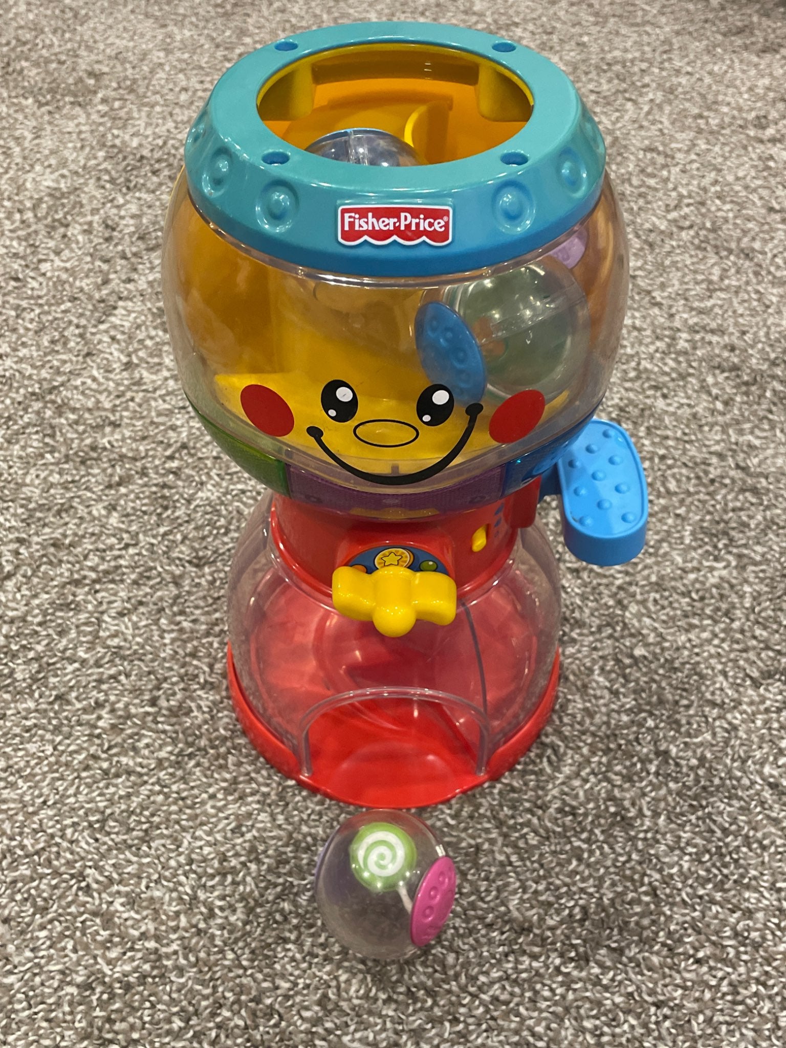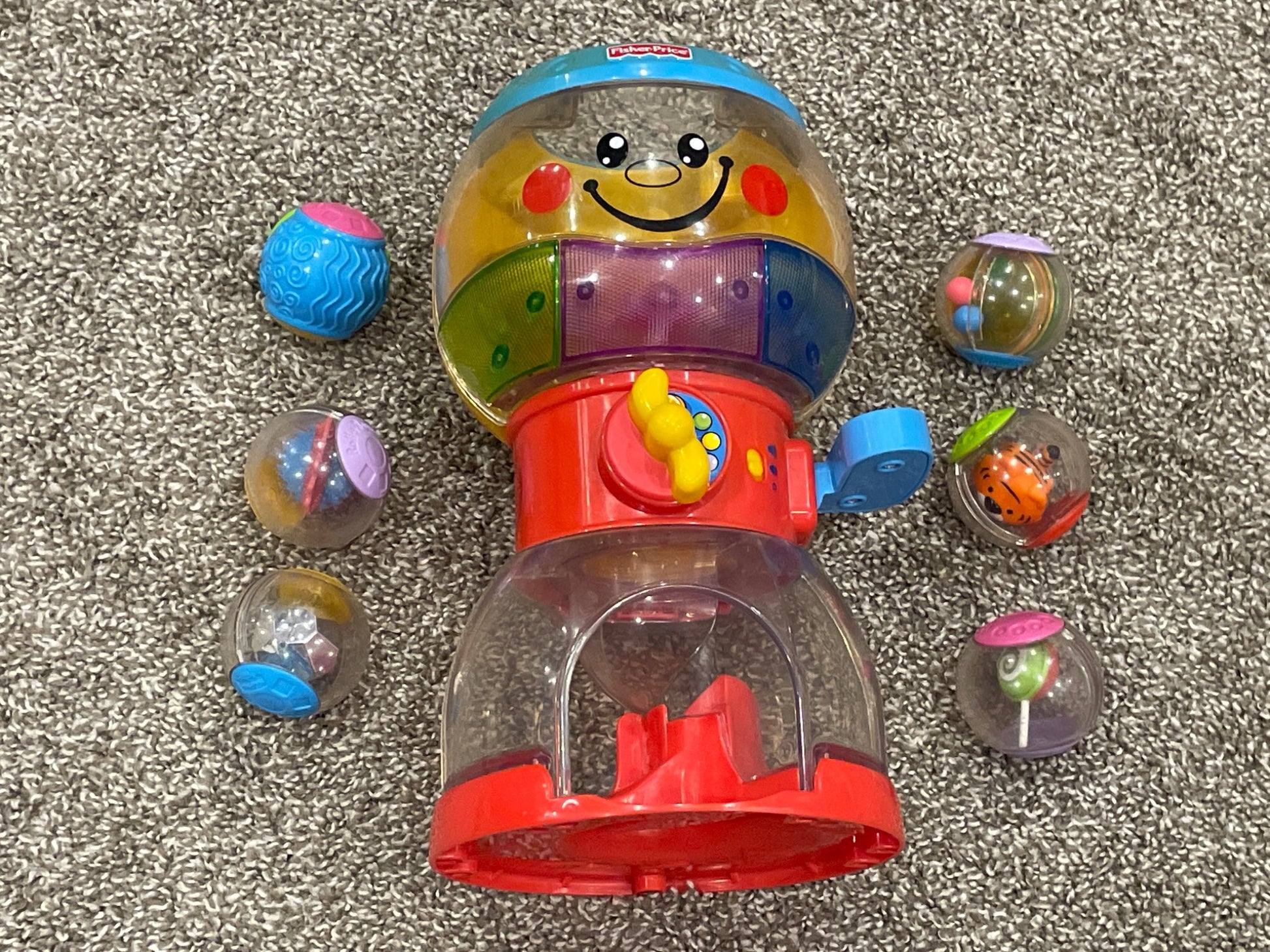 Description : Fisher-Price Roll-a-rounds Swirlin’ Surprise Gumballs. Load the balls in the upper bowl and with each press of the lever, a ball will swirl down the spiral while lights and music play. The ‘coin’ slot makes a clicker sound when turned. Recommended age 6-36 months.