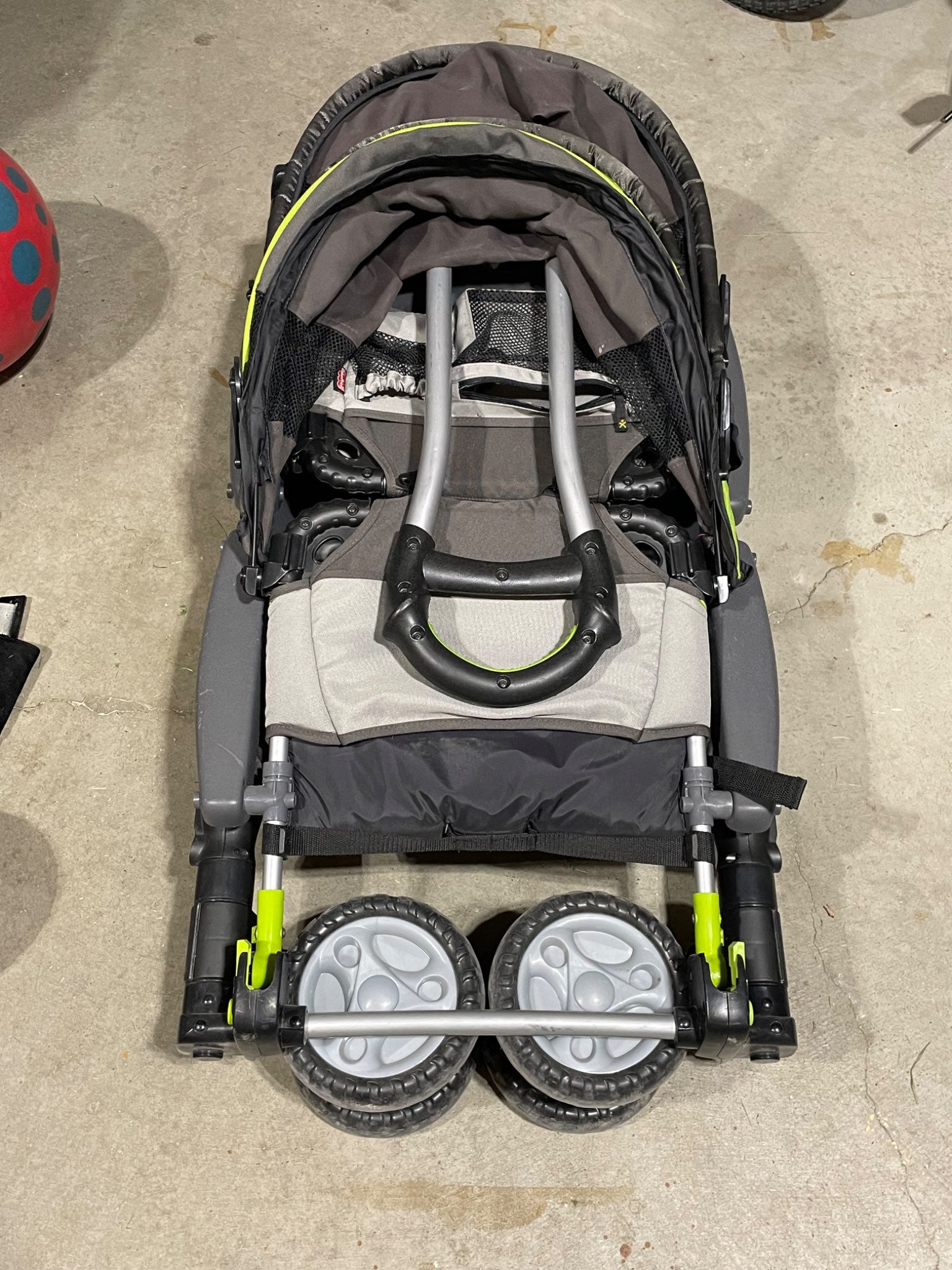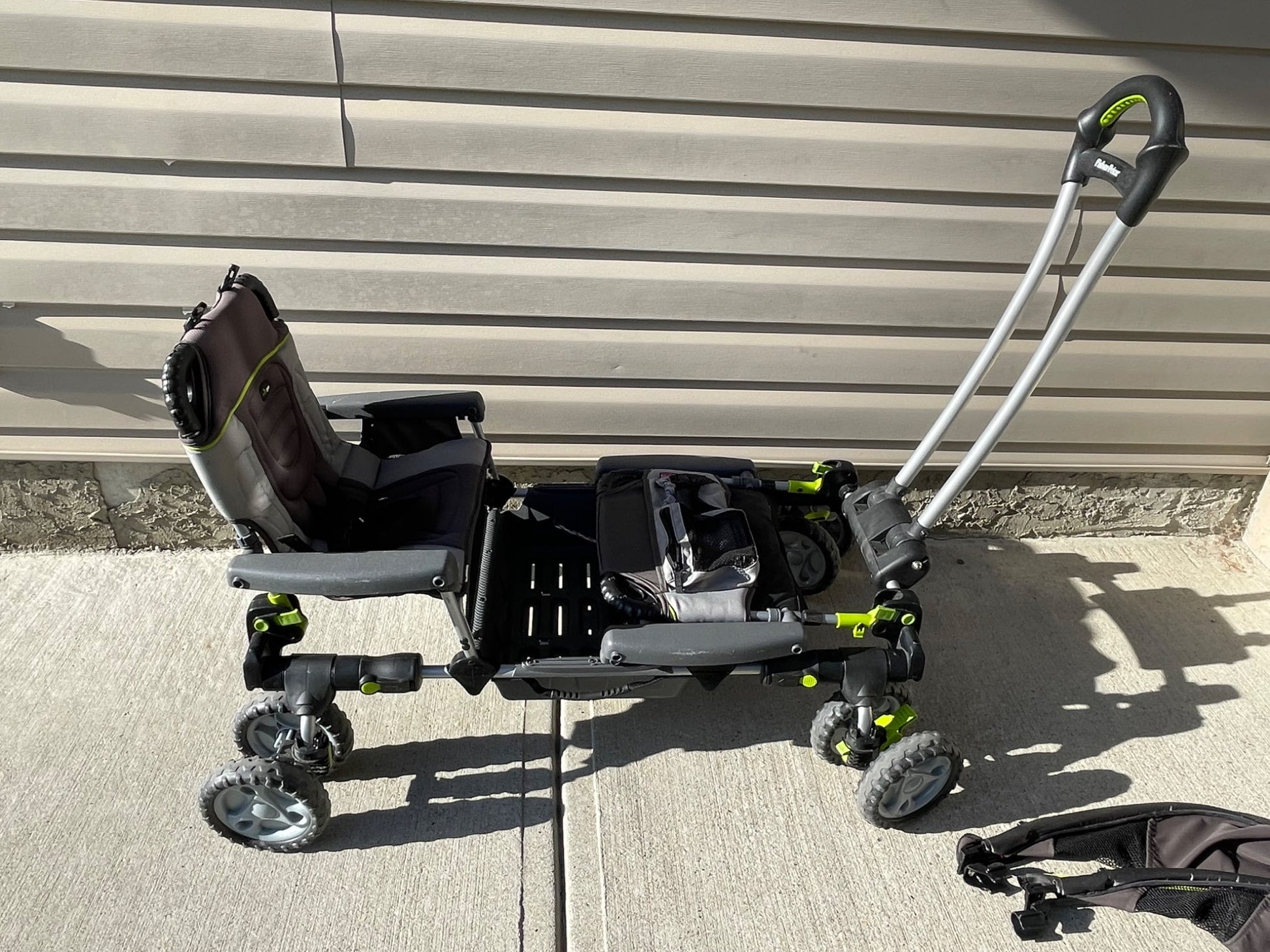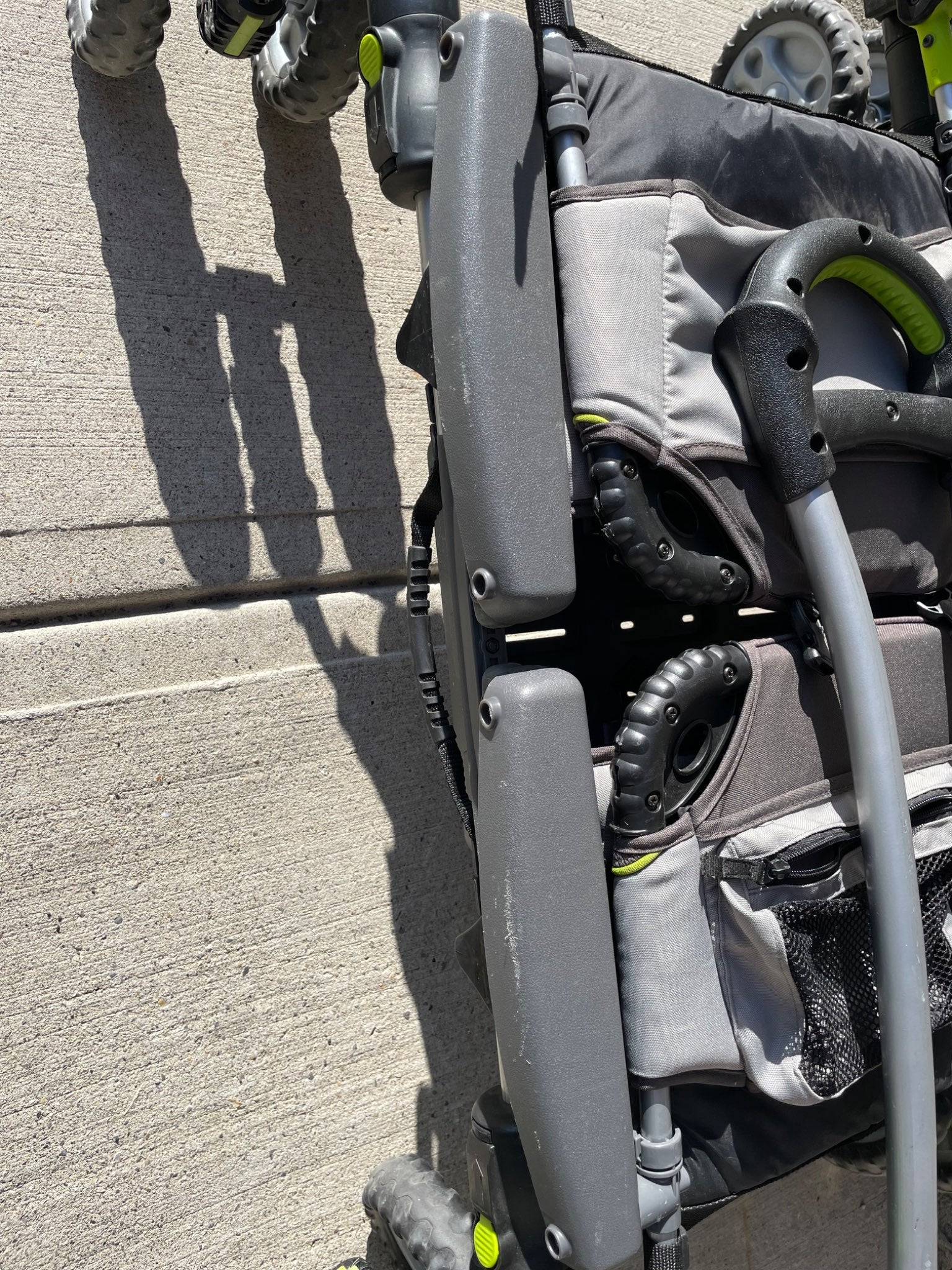 Description : Fisher Price wagon for toddlers. Only has lap belts. Comes with over head shade covers for each seat. Nice comfortable seats for older toddlers. Has some pockets for drinks and to carry other things. Has handle on one side to carry when folded. I loved this wagon and got a lot of compliments, but alas time to let go and another family to enjoy!