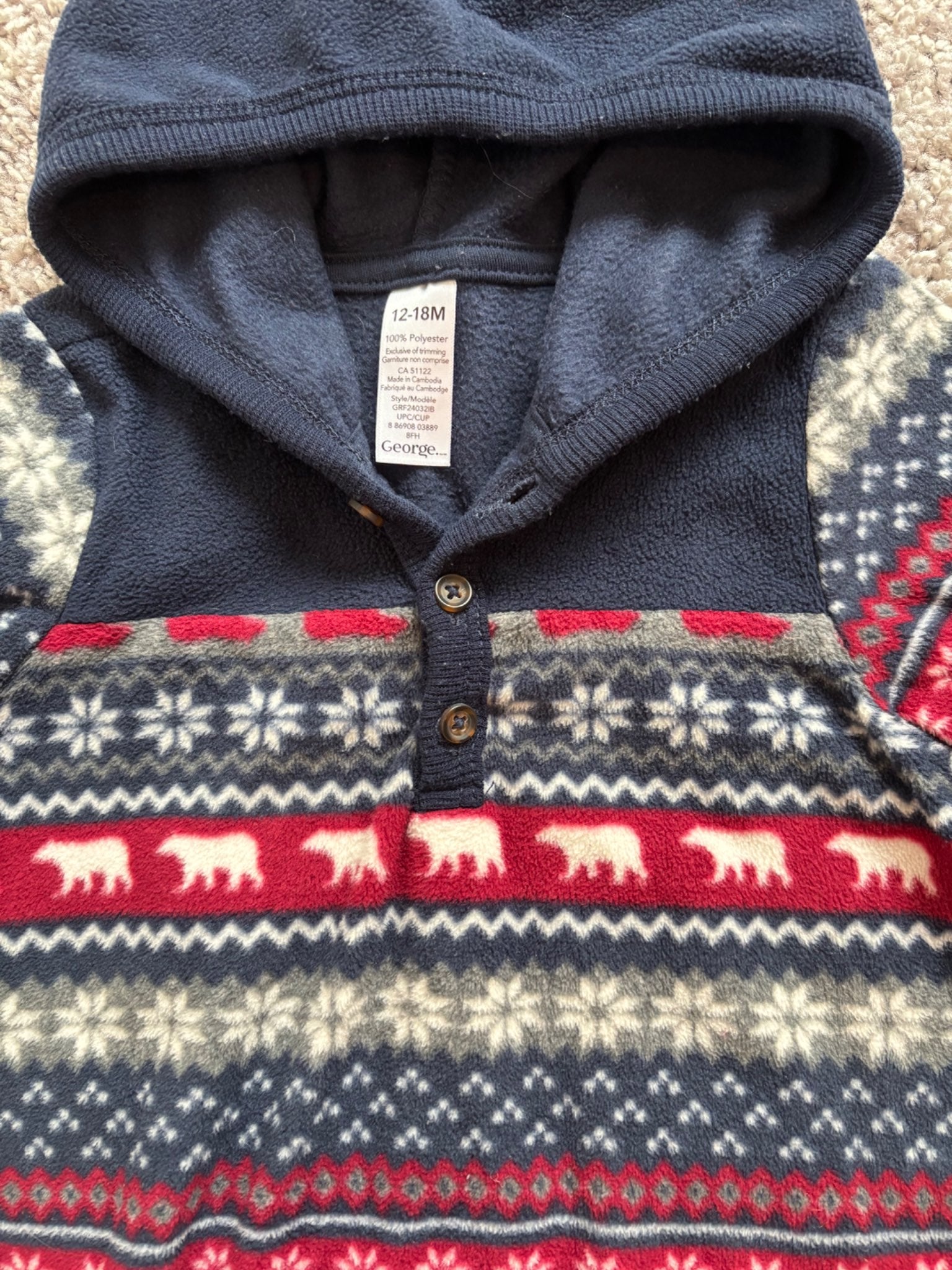 Description : Red polar bear fleece zip-up pajamas, Joe Fresh size 12-18 months. Navy and red hooded romper, snap buttons across legs for diaper access, George size 12-18 months.