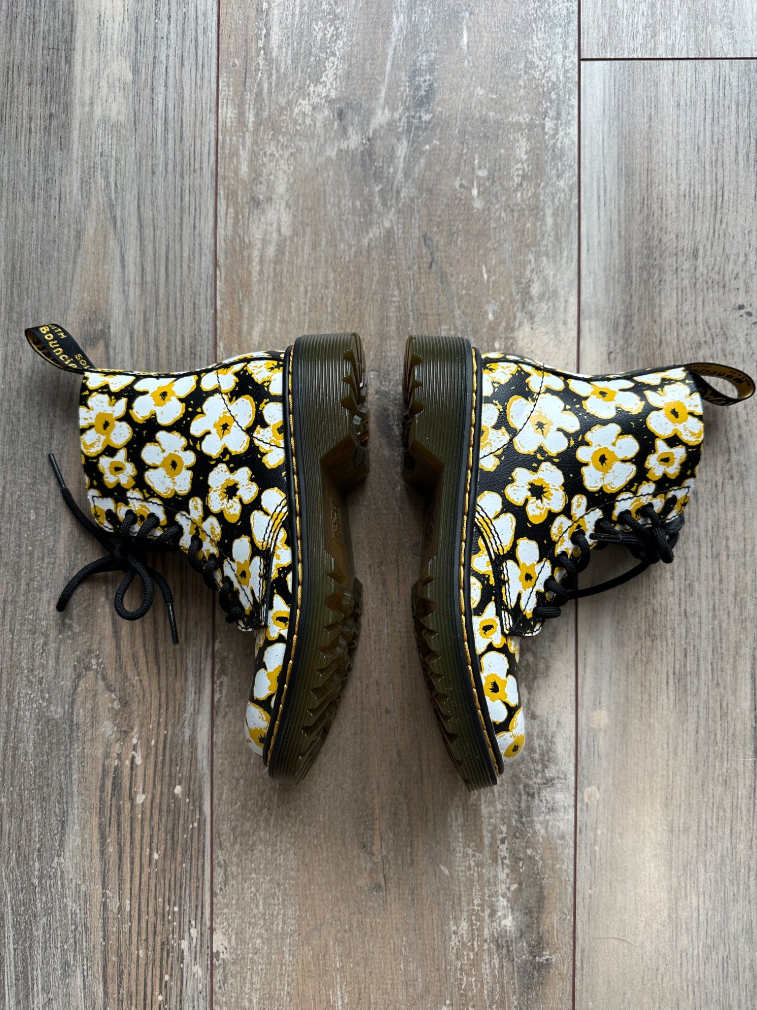 Description : Black Doc Martens 1460 boots with white and yellow flowers. Lace-up and side zip. NWOT.