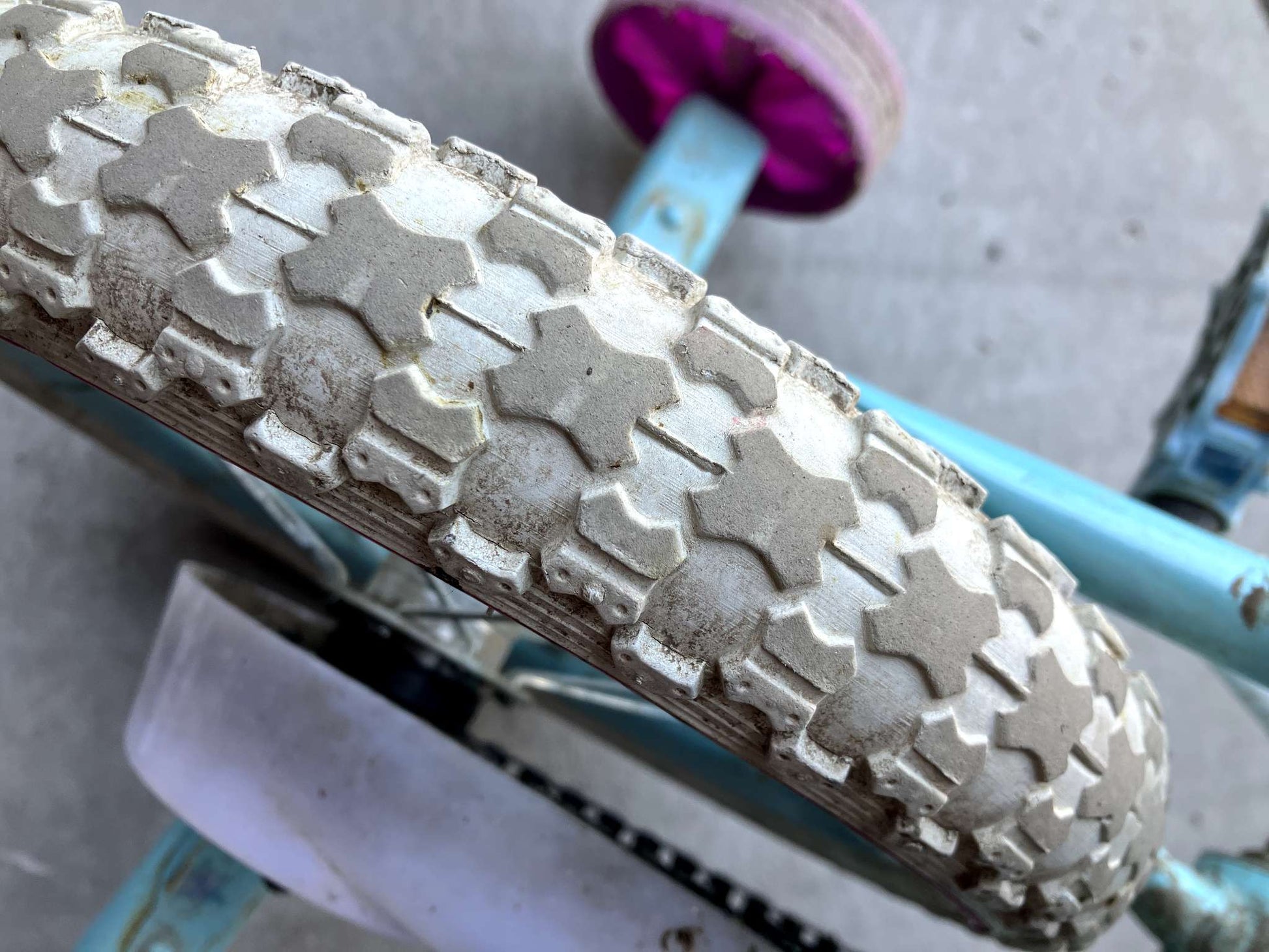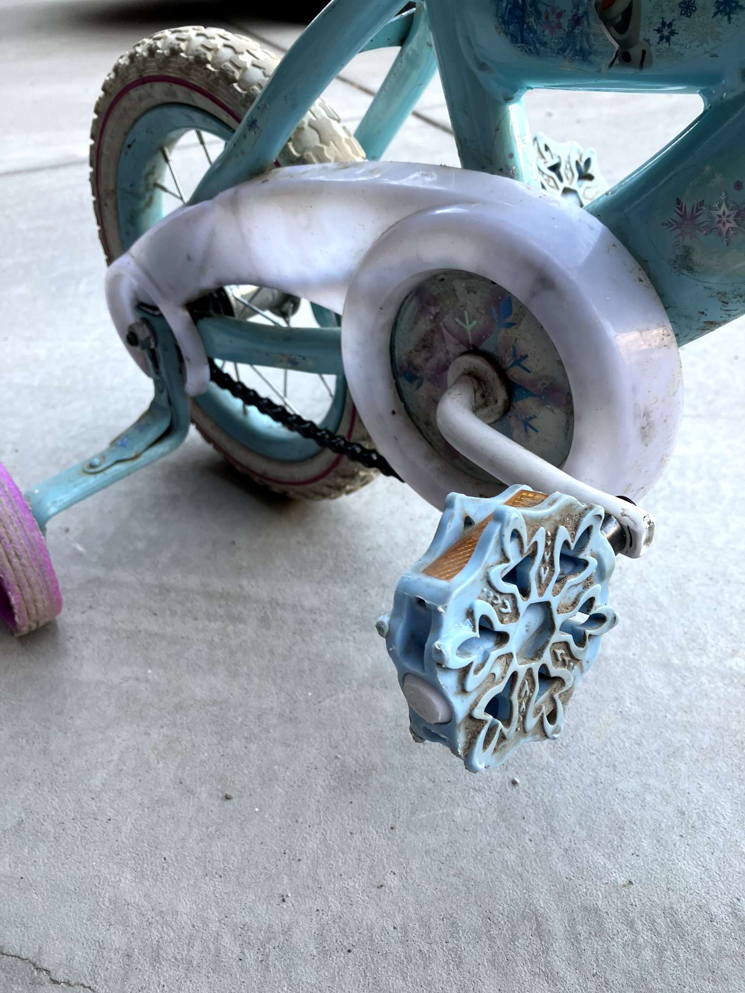 Description : Huffy (Walmart brand) Frozen bike 12 inches with training wheels (can be easily removed). Single speed, coaster brake (brakes when you pedal backwards). Please see photos as well loved but still in excellent shape. Some wear to tread on the back wheel and nicks in the seat. Priced to reflect this. Retails for $128 new. 29 inches from top of handlebars to the ground and 16 inches from lowest seat setting to the ground.