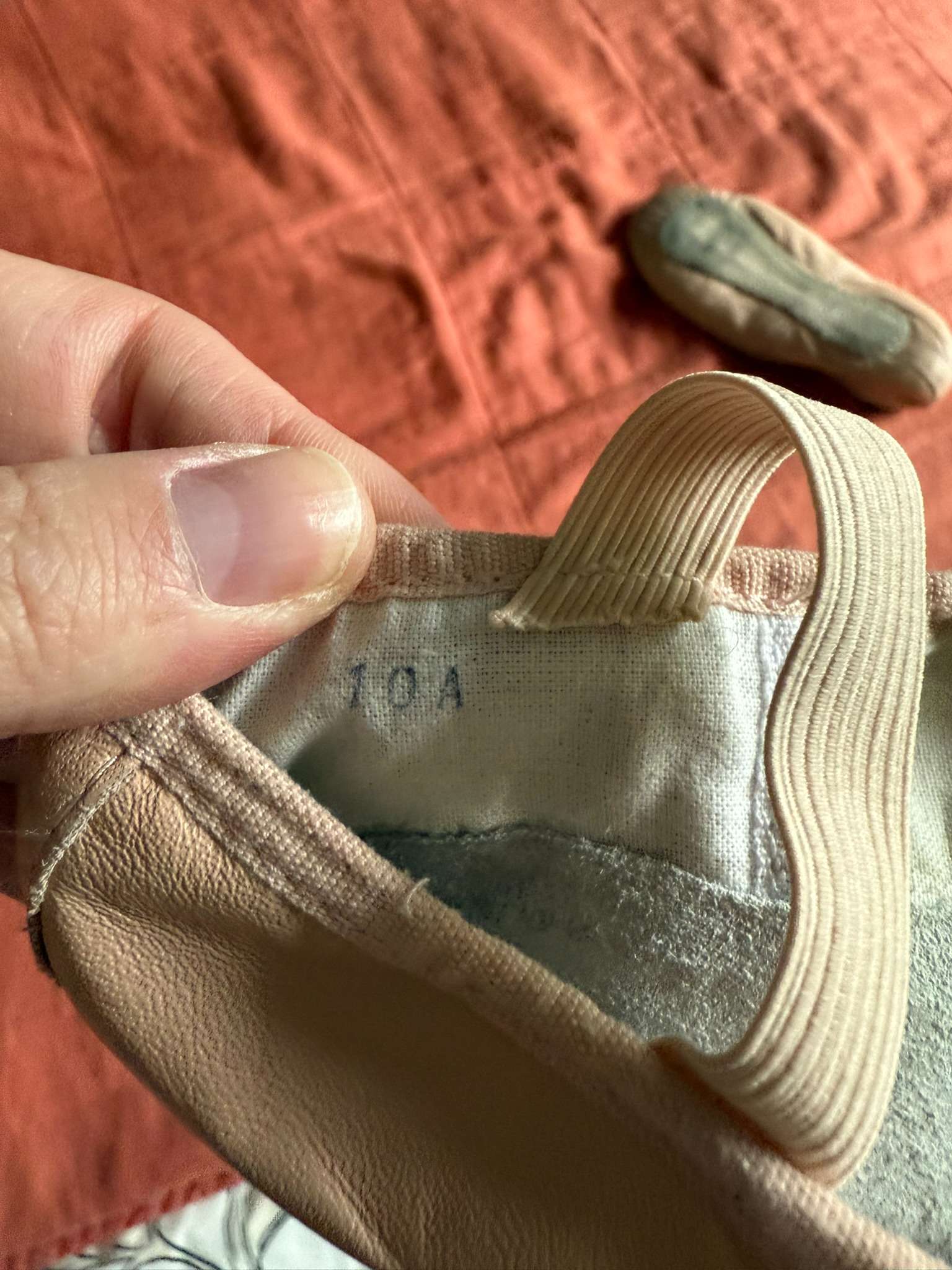 Description : Light pink canvas ballet slippers with elastic strap and suede soles. Lightly worn. Perfect for beginner dance class or dress-up play.