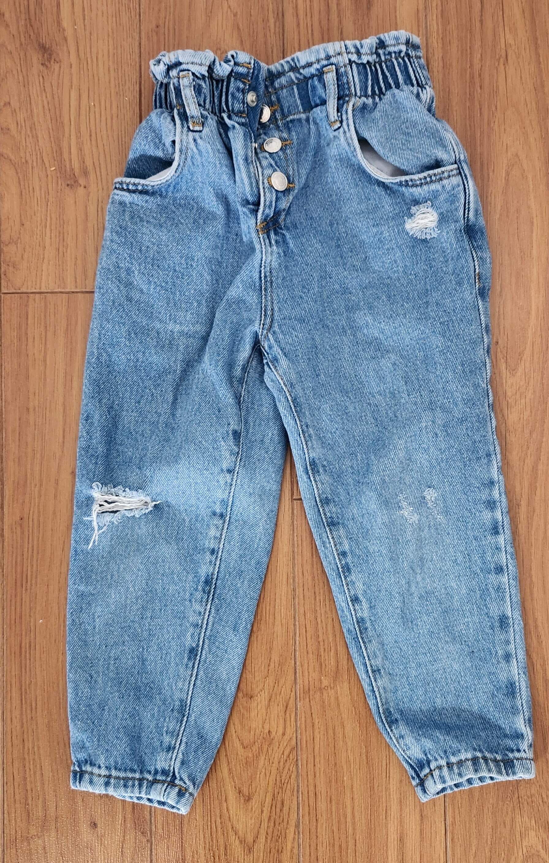 Description : Zara light blue jeans with ripped details, elasticized waistband with three snap closure Size on tag 3-4 years George - navy blue sweatshirt with rainbow - size on tag XS (4-5)