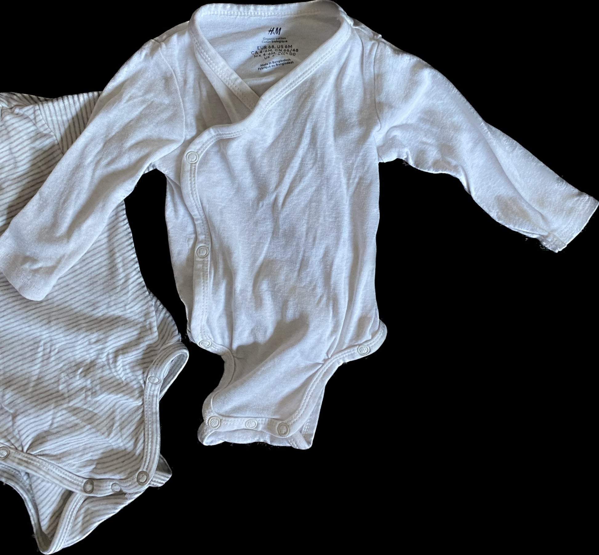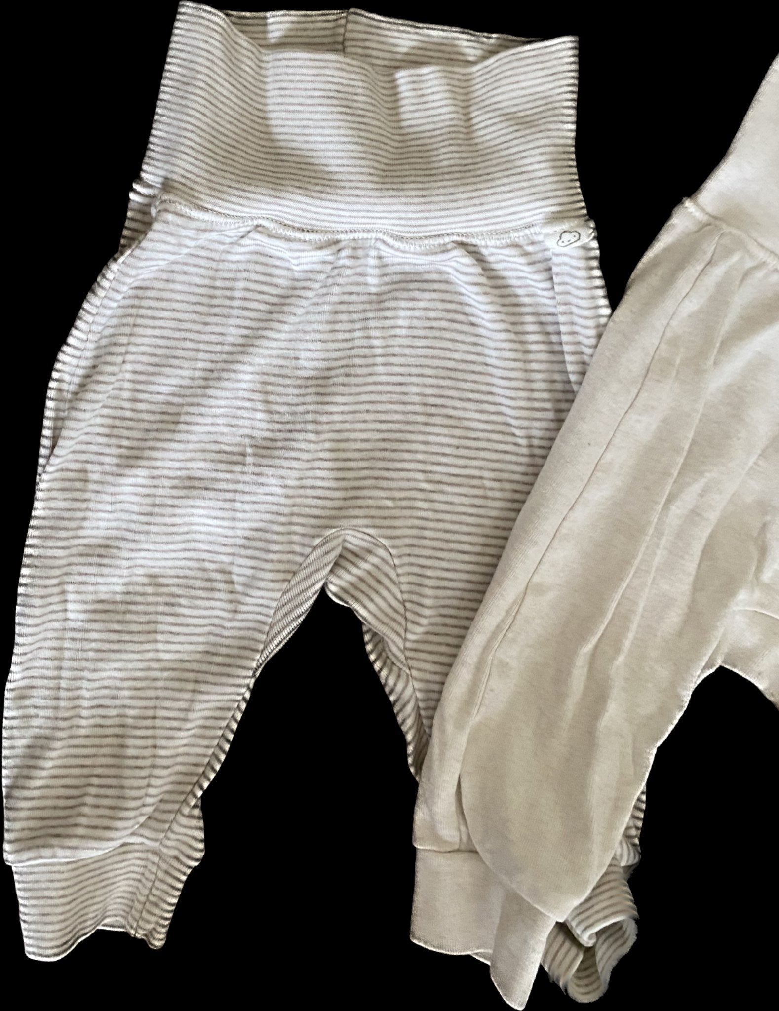 Description : 3 pairs of pants and 2 long sleeve onesies from H&M, tag size 4-6 months but fit my guy for quite a while after that (average size baby) The tops are matching sets with the striped and cream colour bottoms, unfortunately the white top didn’t survive baby food stains. *** colours may look different in first photo since the tops and bottoms were taken in different lighting, they are the same colour! Super soft and cuddly, these were one of our most worn! I love the shirts that don’t go over baby’s head.