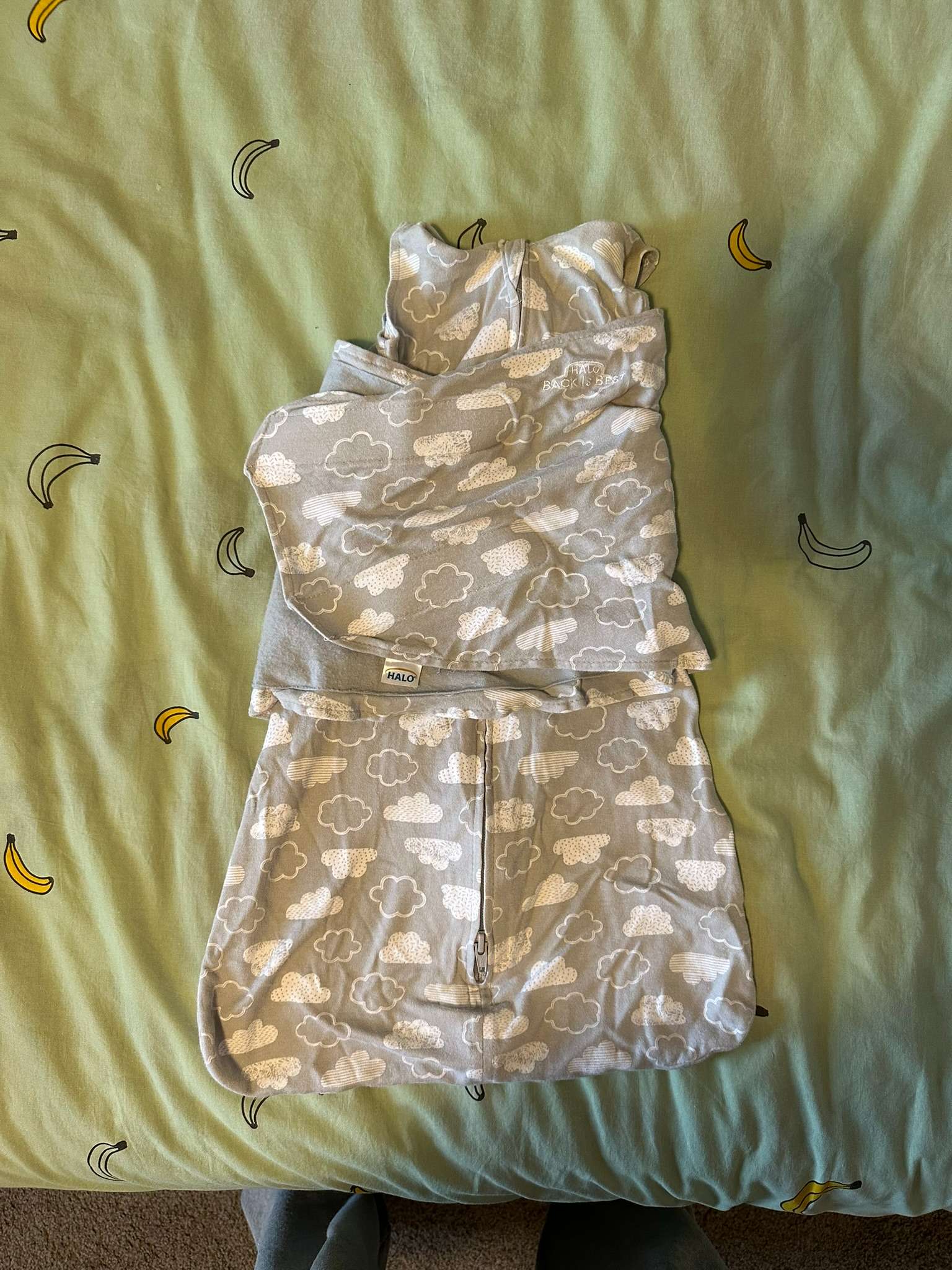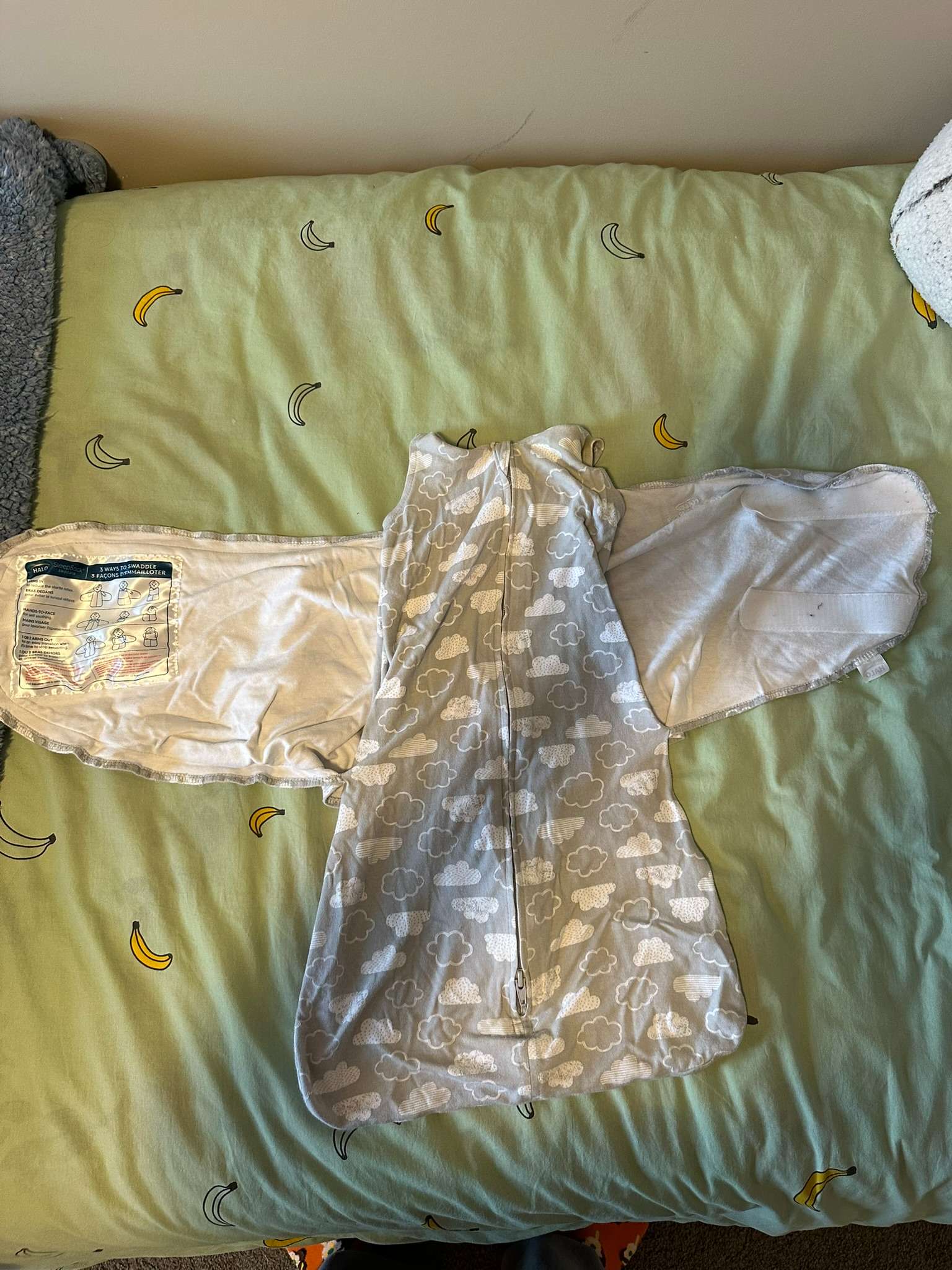 Description : Halo Sleep Sack Swaddle Size S: 3-6 months (6-8kg, 58-66cm / 13-18lb, 23-26in) I believe it was a 1.0 TOG, but not 100% sure. Lightweight, summer appropriate though. Has been washed and used regularly, but well-maintained with virtually no pilling. The velcro is still in great condition. Looks a little stretched from swaddling/washing but it is in very good condition otherwise. From a house that previously had a cat