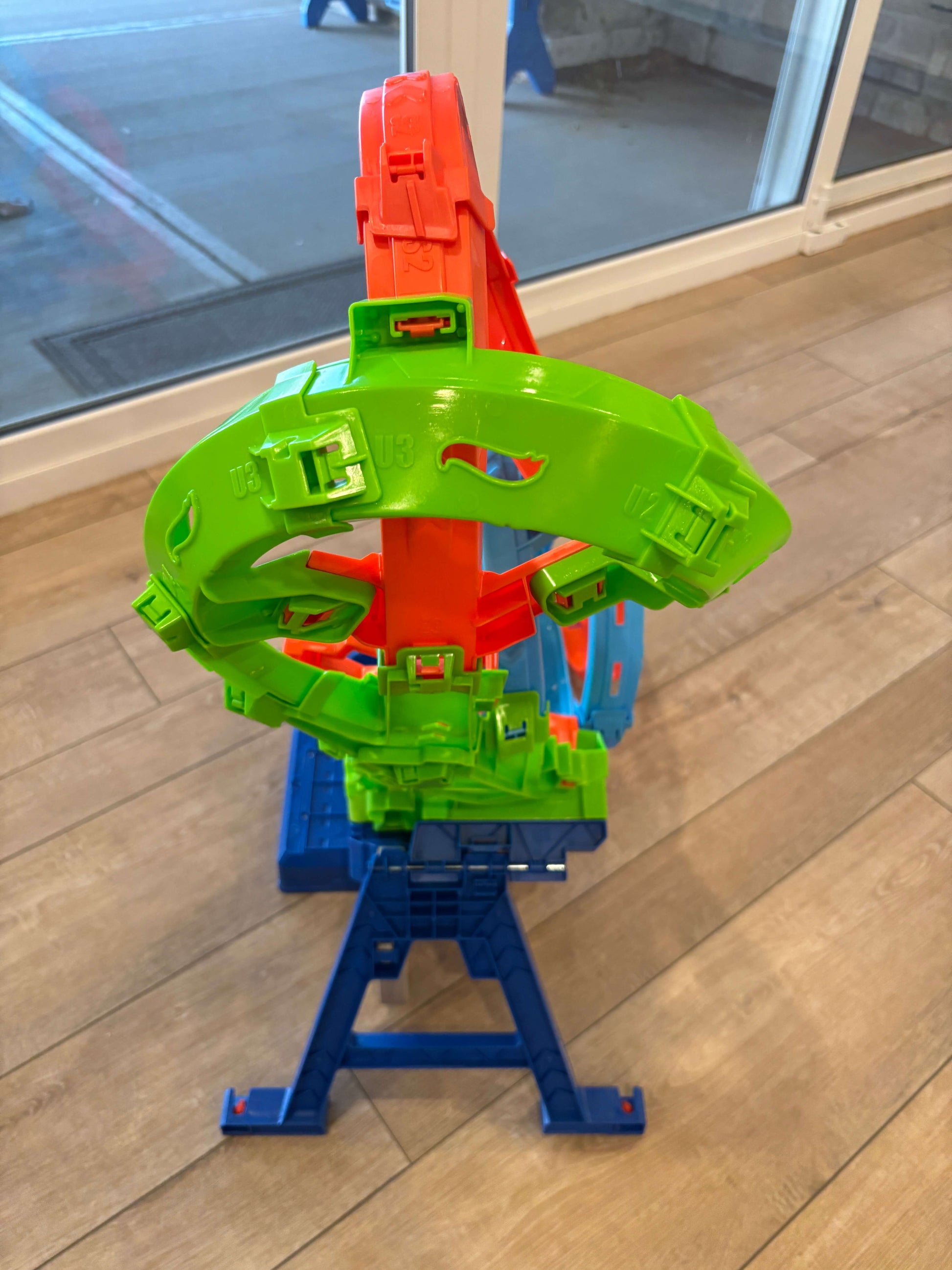 Description : Played with once. No cars included. Speed through four awesome loops and a three-way crash zone with the Hot Wheels Action 4-Loop Crash Out track set. The motorized booster keeps cars moving for greater thrills, and the challenge lies in how many cars can race at once before there's an inevitable crash. The set folds for easy storage, and there's space on the booster to park five 1:64 scale toy cars.