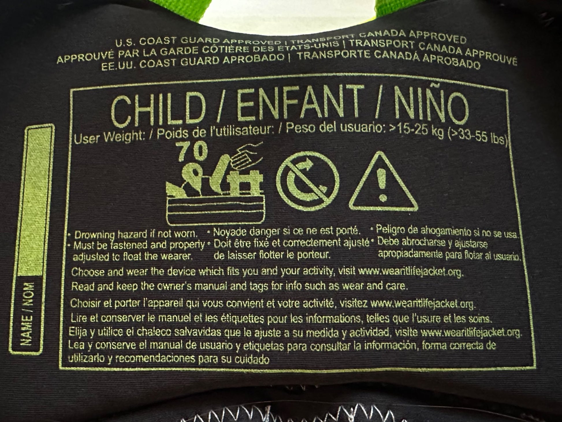 Description : Child Life Jacket – 33–55 lbs US Coast Guard & Transport Canada approved. Blue and yellow, secure fit, excellent condition.