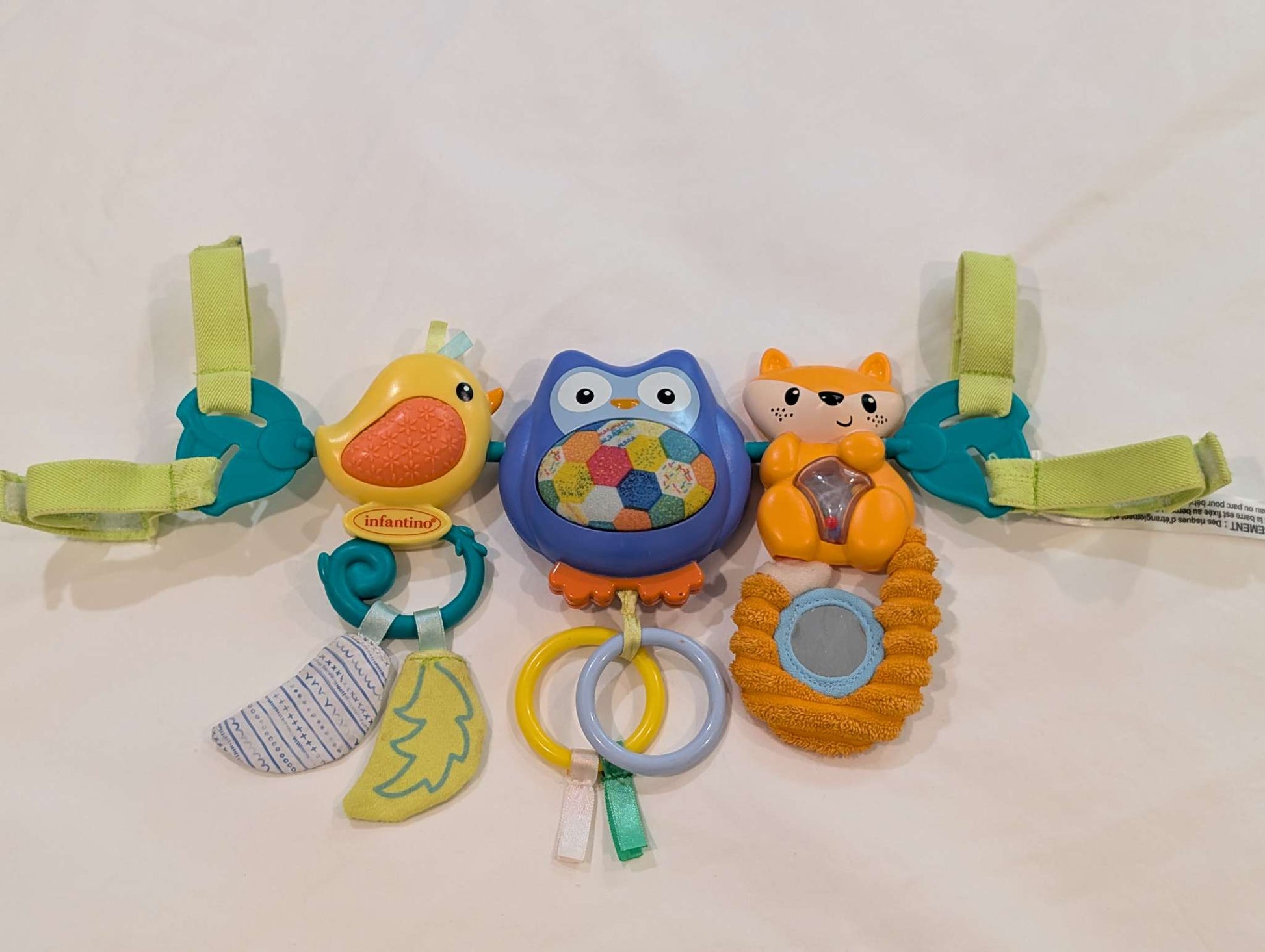 Description : Minor scratches and colour on rings where they hit owls feet, animal flip fully around the bar, fox shakes like a rattle and has a little mirror, bird has textured wing and leaves, owl stack has textured/patterned fabric, lights up and is a button to activate music and sounds Straps have Velcro and are stretchy making it easy to fit on most strollers or car seats