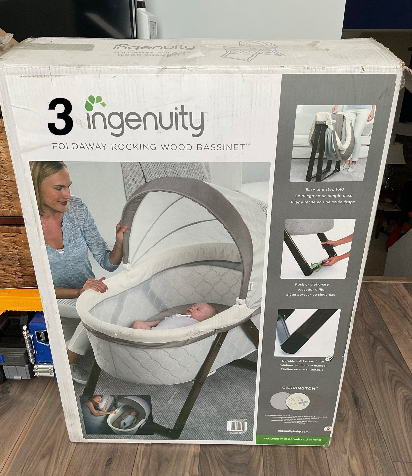 Description : Designed with parenthood in mind.™ The light-weight FoldAway Rocking Bassinet - Wood™ was for the baby that travels in style. Ingenuity™ understands the importance of convenience and portability. The easy one step folding wooden frame folds down within seconds, making the bassinet great for on the go and storage. Two modes of the wooden sleeper allow versatility to either gently rock baby to sleep or leave in stationary mode when baby is sleeping. The modern design of the wooden bassinet and neutral grey tones are sure to compliment any home décor. The neutral fashion is well-suited for baby girl or baby boy. Dream Comfort™ premium fabric diffuses light for baby and allows airflow for cooler comfort. The comfort pad is machine-washable making cleanup a breeze. Safety-enhanced with slip-resistant feet. It can be used from newborn - 15 lbs maximum capacity.