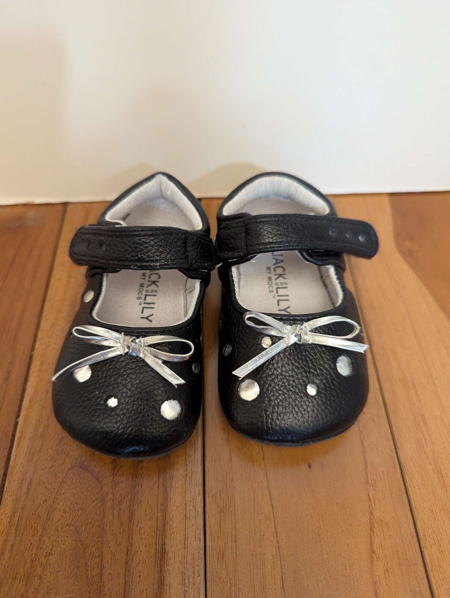 Description : Jack & Lily infant shoes, size 4, black with silver details, genuine leather lining, designed in Canada, velcro strap