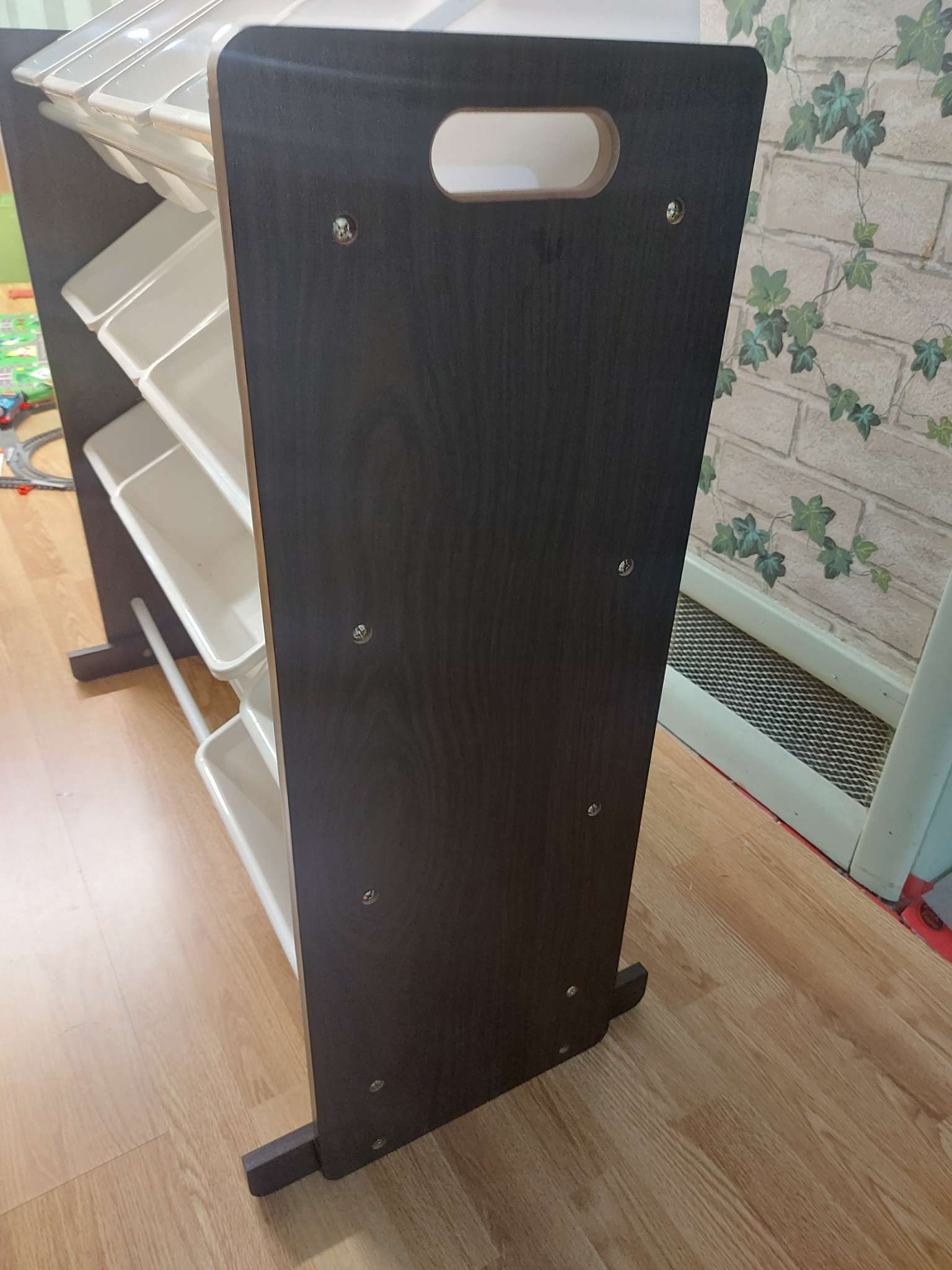 Description : Very good condition, color espresso/white. Total of 11 bins included as shown in the picture. No cracks on any of the bins.