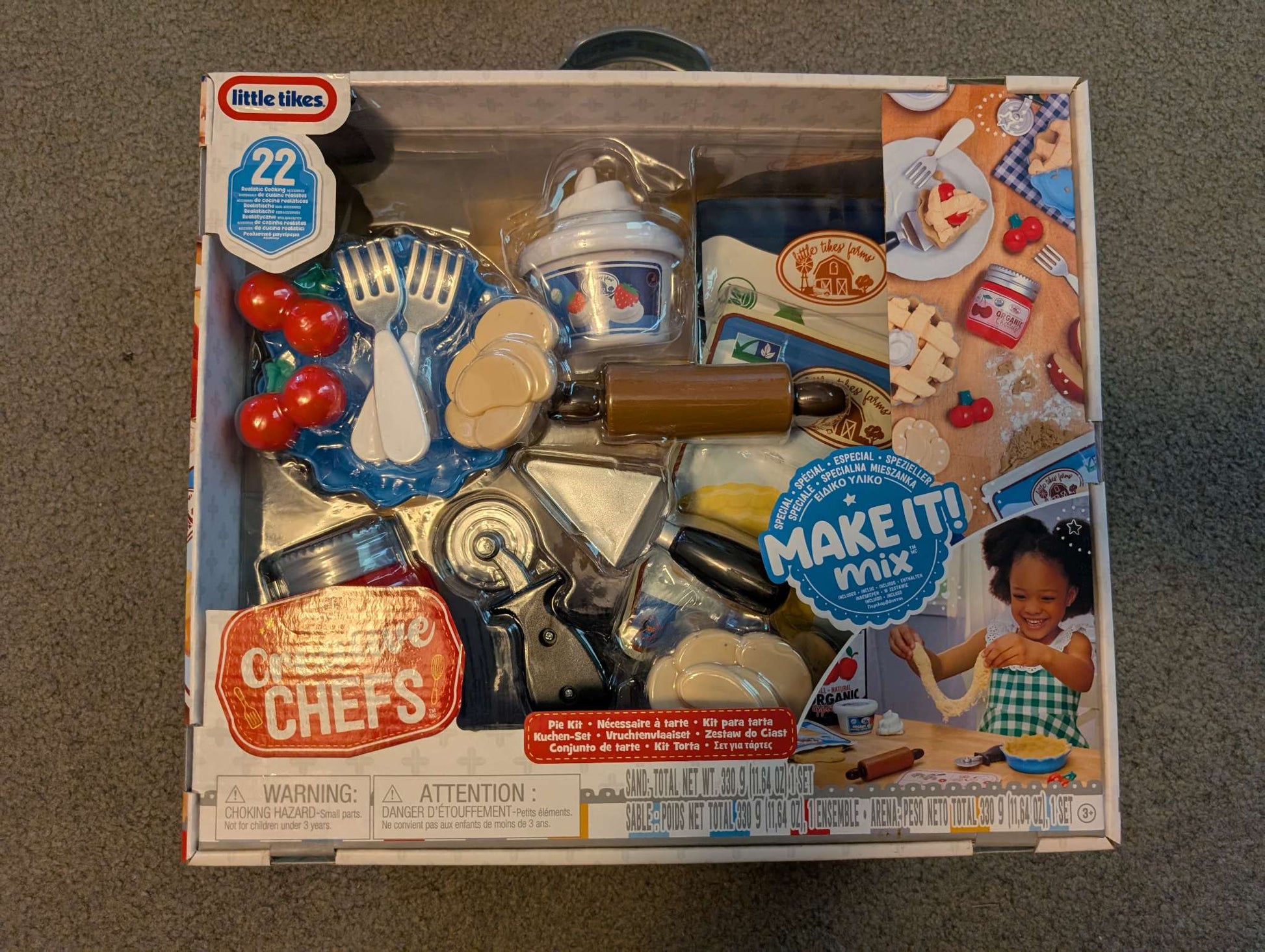 Description : Your little baker will have everything they need to practice making pies with this realistic Pie Kit. With the visual recipe card, kids can learn the basics of baking with moldable and reusable Make-It! Mix™ ingredients. This Pie Kit features hyper-detailed play food and utensils for bakers-in-training to get a feel for the real culinary experience during playtime. Kids can mix, roll, and assemble Make-It! Mix™ pies with the help of functional pie pans, rolling pin, and serving utensils. The pie kit package also unfolds into a play table to give your young one a portable workstation where they can play independently or with friends.
