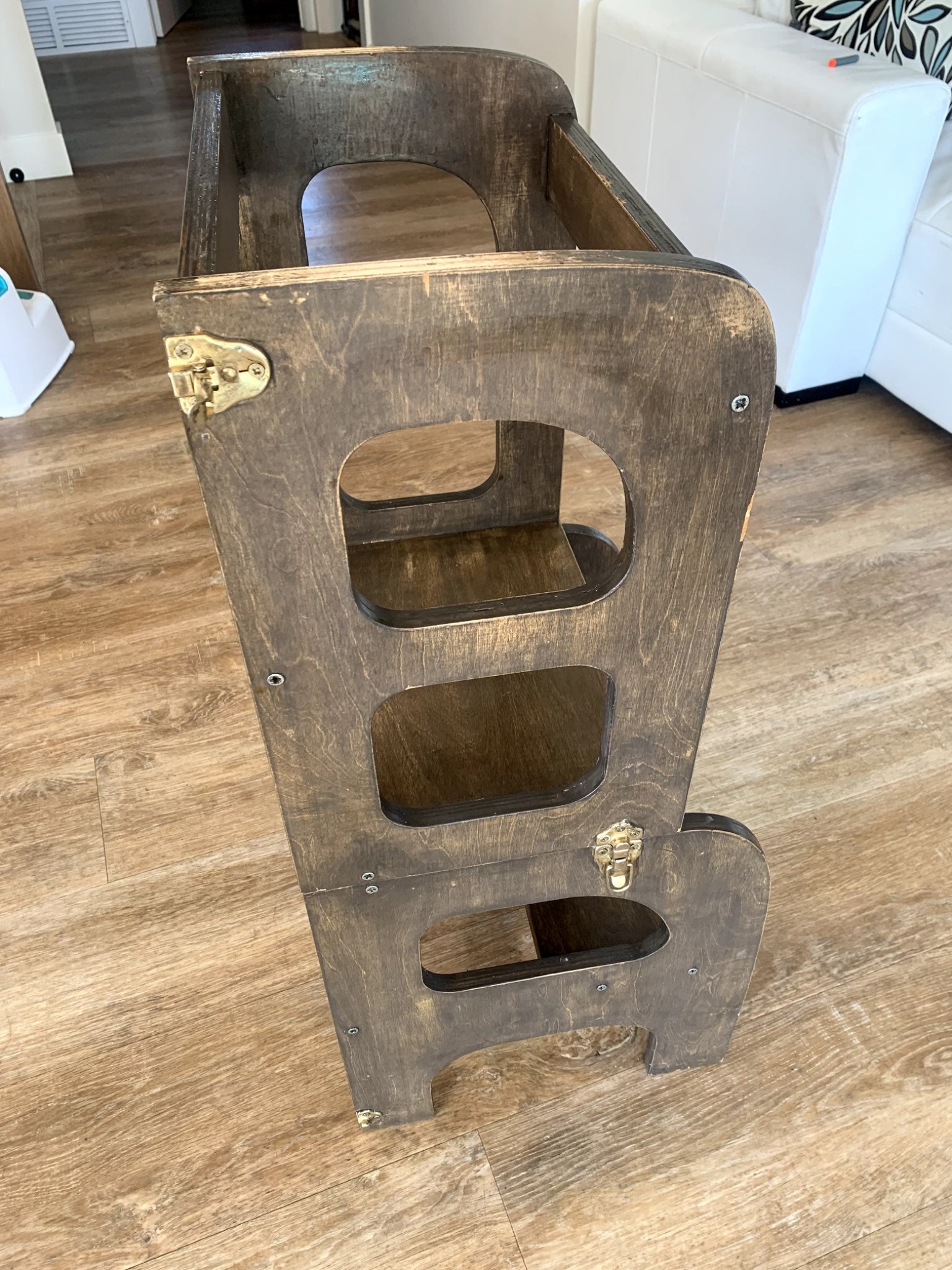 Description : Convertible Learning Tower and Table Use at the counter for your little helper or convert to a table to eat at or play. (could use a new coat of stain)
