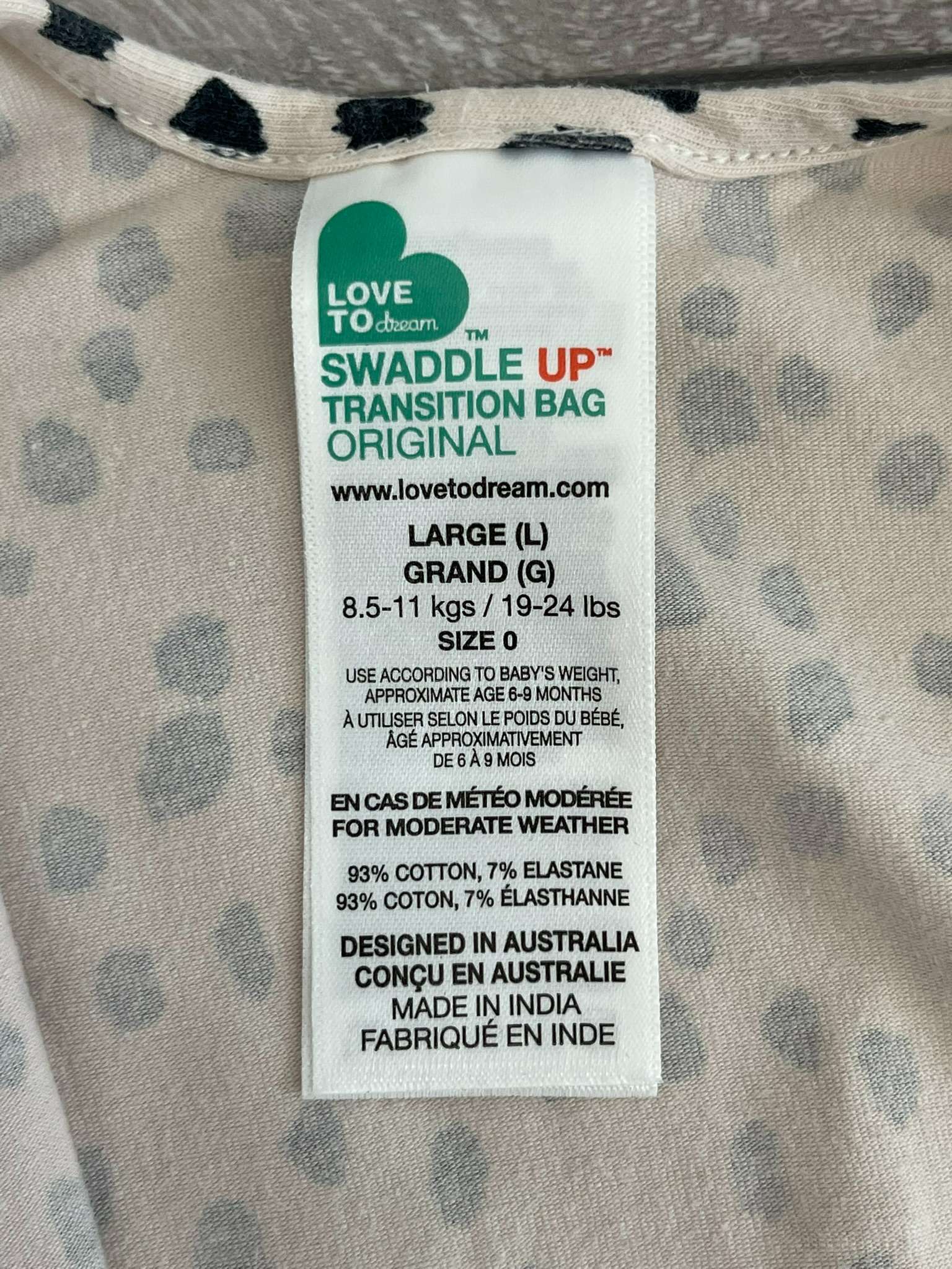 - Size large (6-9 months).