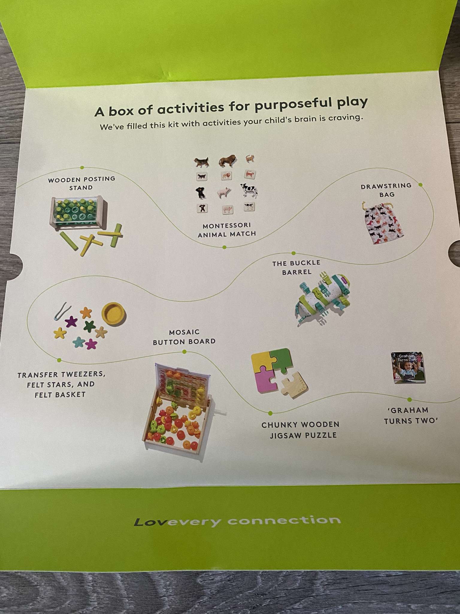Description : The Companion Play Kit gives your toddler a stronger grasp on the real world with fun spatial experiments and matching and sorting challenges. All toys in this play kit are new, never been used - the box was opened only to take photos. The kit comes with the following toys/book: Wooden Posting Stand Montessori Animal Match Drawstring bag The Buckle Barrel Transfer Tweezers, Felts Stars and Felt Basket Mosaic Button Board Chunky Wooden Jigsaw Puzzle Graham Turns Two Book