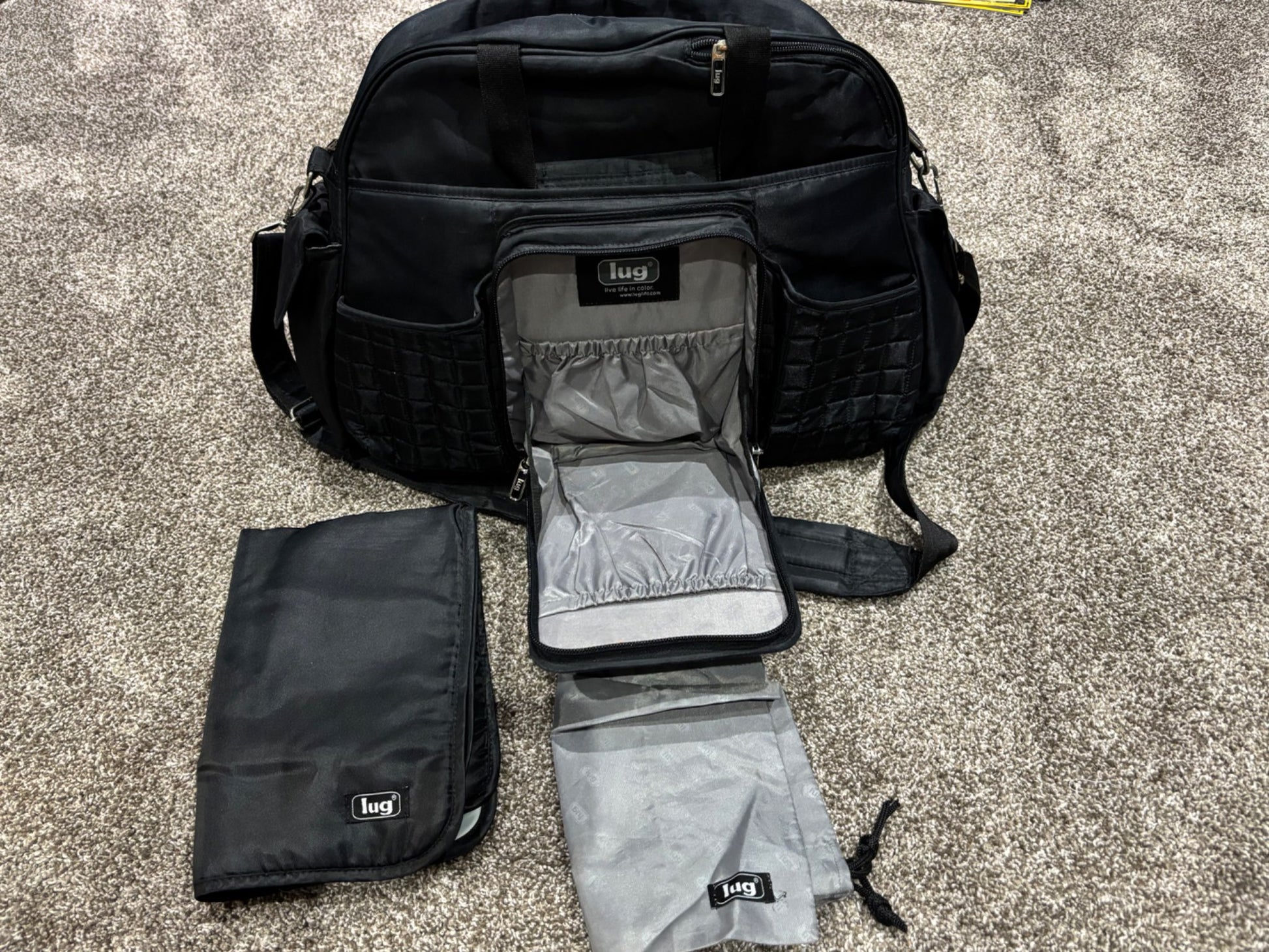 Description : Black LUG diaper bag with change pad, numerous zippered and non -zippered pockets as well as a mesh easy-access pocket. Used by daddy as a second diaper bag, loved with a lot of life left. Some tarnishing of zipper tags and a bit of fray in one place on detachable strap, as shown.