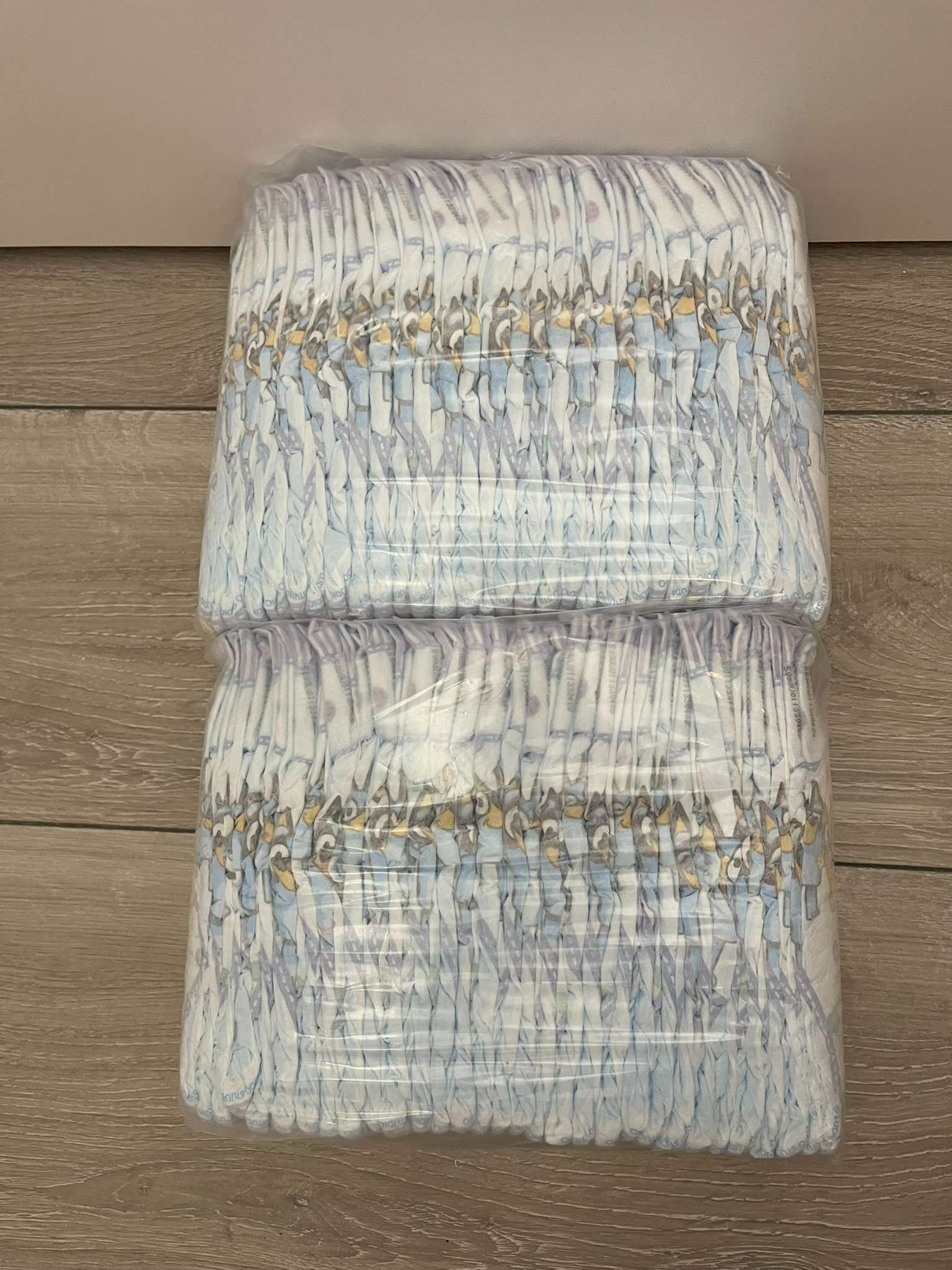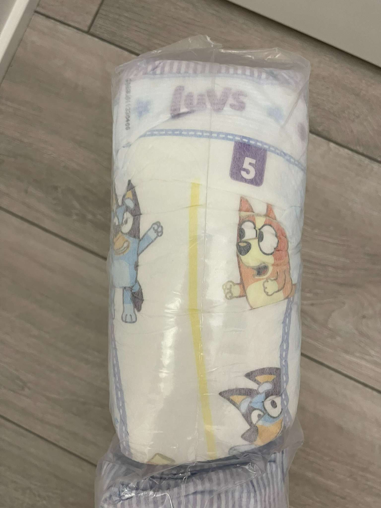 Description : New, unopened sleeve (62 diapers) of Luvs Platinum Protection Baby Diapers, Size 5, Bluey print, 2 designs.